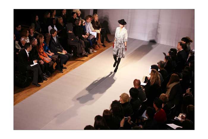 Prints, including a black and white teardrop print on a chiffon pussy-bow blouse, were subtle, and the colour palette was dark – predominantly black and grey, with earthier colours. Flashes of understated glamour came from muted gold, gilt brocade trims and flashes of ruby, as well as luxurious evening fabrics.