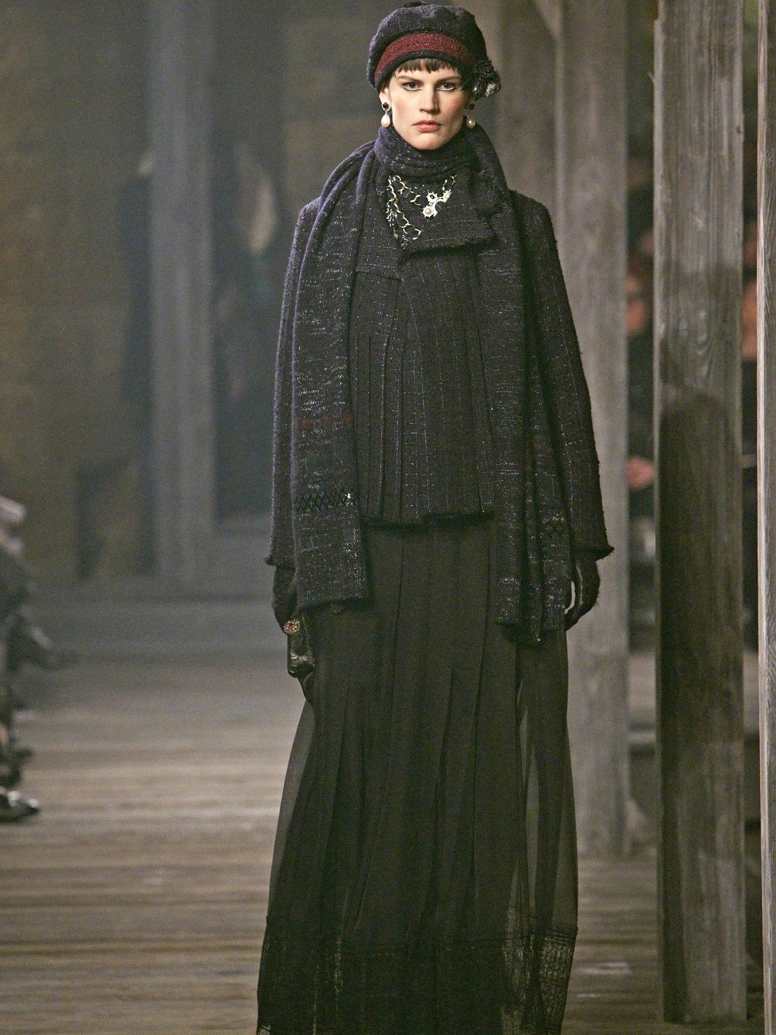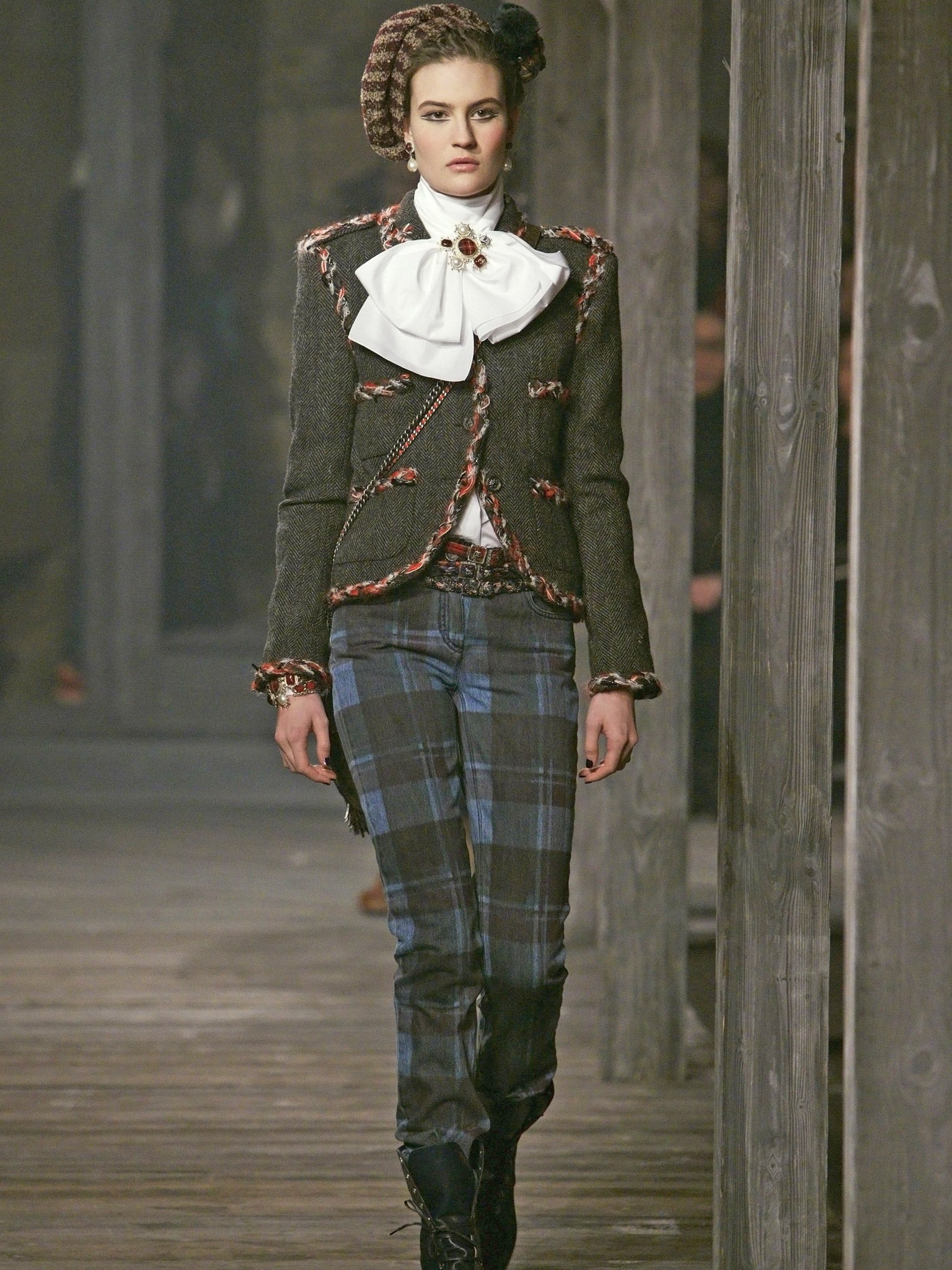 Lagerfeld spoke fondly of Scotland after the show and said the collection was "a mix of Coco Chanel and Mary Queen of Scots" and represented "the rebirth of her spirit". The romantic setting was fitting for models who walked within the castle walls with high, bejewelled hair and clothes fit for a queen. Quintessential Chanel tweeds were softened with full-length lace skirts and layered under Argyle and tartan-patterned knitwear.