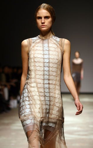 If Schwab's collection was far from easy to wear, then Betty Jackson's collection begged to be snatched directly off the catwalk. The dresses were a high point – there were loosely fitted styles with sack backs, short organza dresses with diagonal tiered layers in mink brown and dove grey, and strapless prom dresses.
