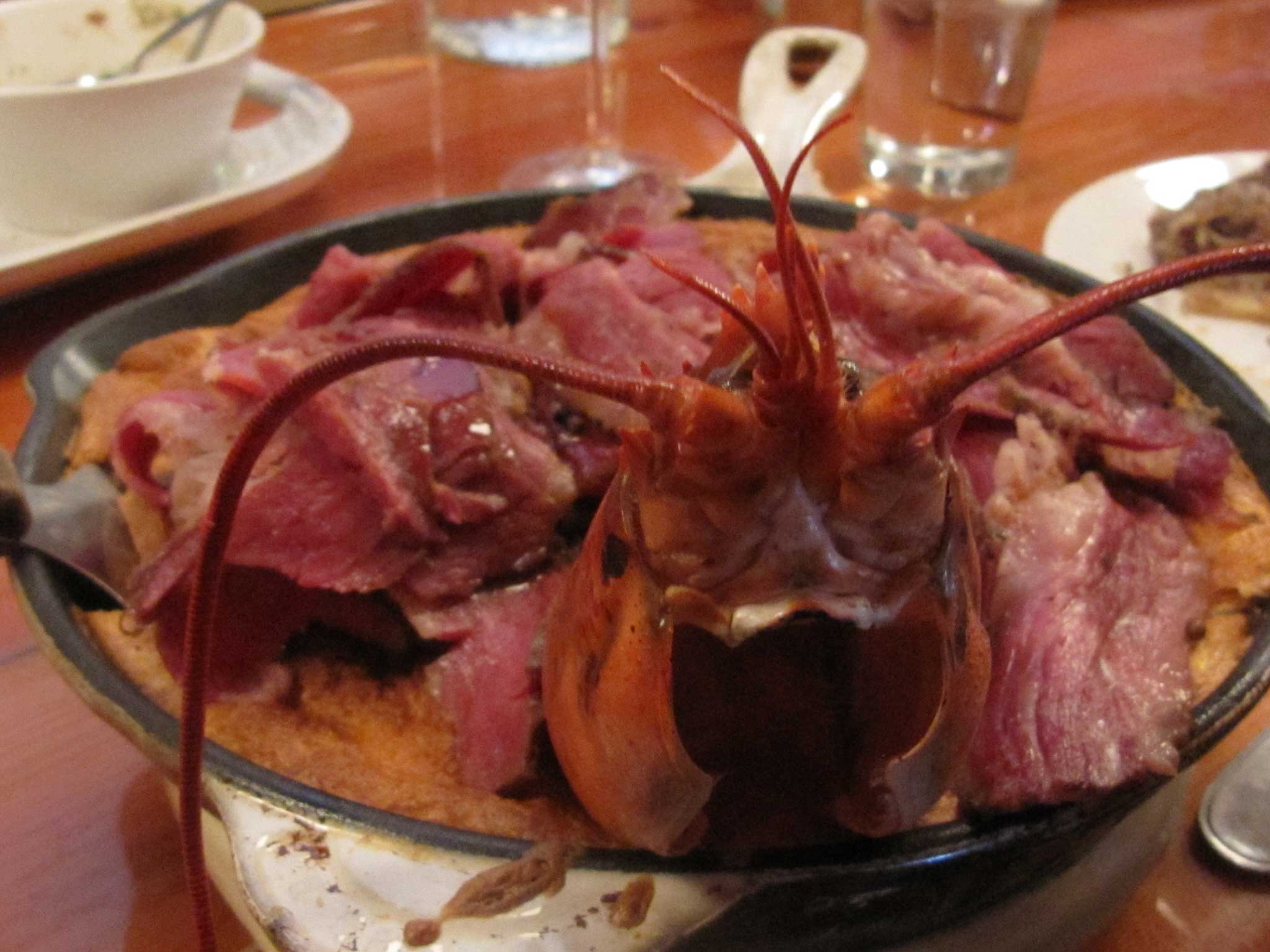 The servers trundle dishes out on wheeled trolleys. There's cretons, the rillettes-ish pork studded with sweetbreads and cubes of boudin noir, its mustard and whipped goat's cheese accompaniments syrup-spiked. Even the blamelessness of a token fennel salad is pleasurably defiled by maple-candied pecans. Then maple-pickled herring and onions, a whole fish, with maple mayo. Omelette soufflé, a skillet the size of a regular frying pan, probably a dozen eggs and a whole lobster, rich with duck fat, crowned with fleshy layers of Montreal's beloved smoked beef and glazed with syrup-laced brown butter.