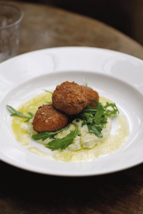 Crab cakes with Tabasco butter and puréed fennel