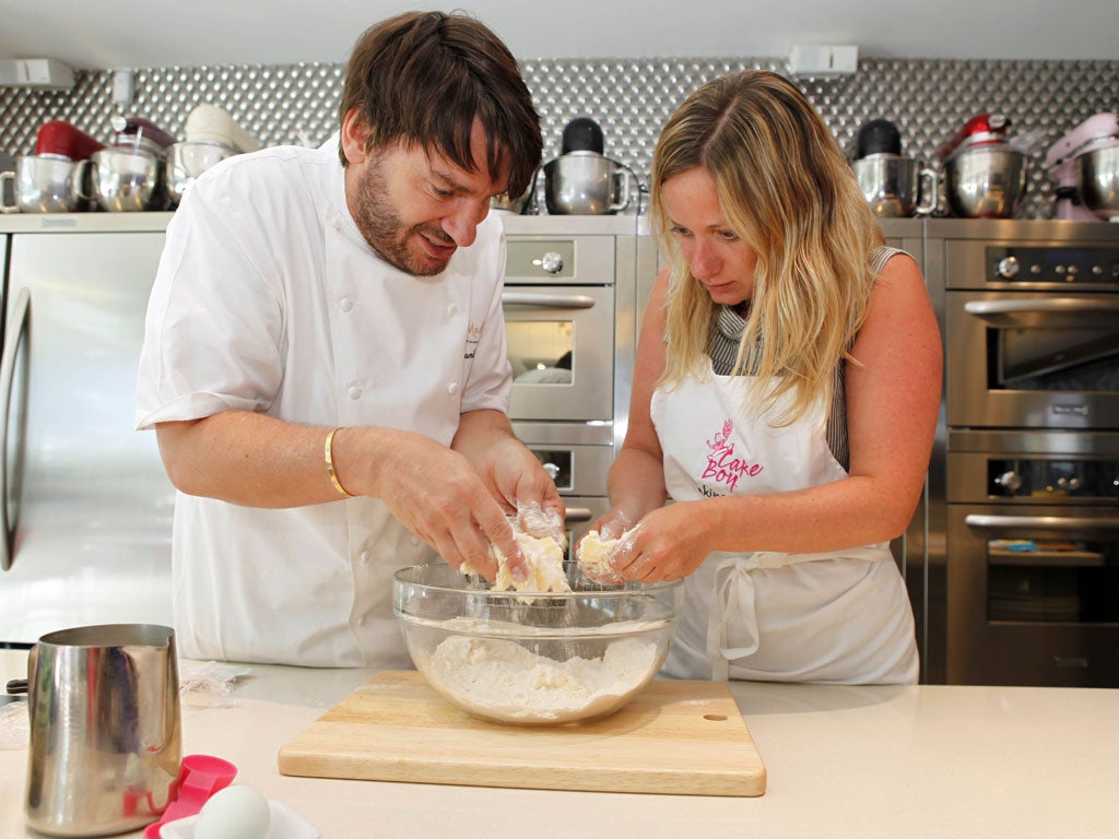 He thinks that baking appeals to men – he says the 12-man-strong secret baking club, run by the Harlequins rugby team, is highly competitive. Savoury pastries have particular appeal, with pies being a bit more "blokey" than the average cake. "Boys are much more attentive – they take the recipe and are very precise," he says. Lanlard, who made Brooklyn Beckham's first birthday cake, has run baking classes for five years, increasing from once a month to weekly. He finds that corporate teams also come to bake. "Rather than go- karting or clay pigeon shooting, it's baking," he says. "We get stuck in with our fingers, crumbling butter – unsalted President butter [Lanlard believes French butters have lower water content than some British brands] – and flour. Baking is about getting your hands dirty."