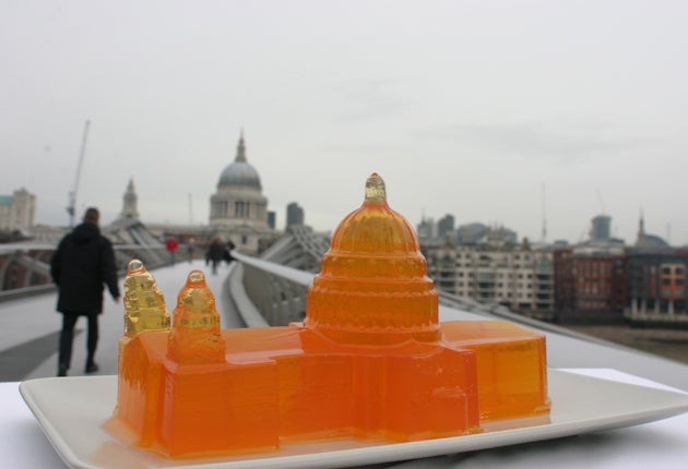 The plan was to use antique copper moulds, until they realised they couldn't afford them – a blessing in disguise, as it was then that Parr realised he could call on the skills he'd acquired as a trainee architect to make their own, creating 3-D computer models of any given structure and then forming plastic moulds from them. Subsequently, they have produced jelly replicas of everything from St Paul's Cathedral to a nuclear submarine and a topographical map of America, while clients have included Sir Richard Rogers, Mark Ronson, and indeed, Blumenthal himself, who they collaborated with on the Channel 4 show Heston's Victorian Feast.