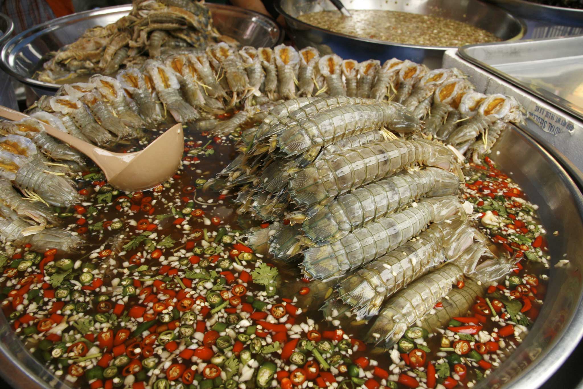 On every corner a cook is bent over a blazing wok, surrounded by a cornucopia of dazzling ingredients – wriggling freshwater prawns, giant lobsters and crabs, freshly-caught seabass, pomfret and grouper fish, plump frogs' legs and snails, clams and exotic crustaceans that look more like sci-fi creatures, myriad exotic vegetables, and delicious tropical fruits ranging from tangy rambutans and lychees to sweet papaya and pungent durian.