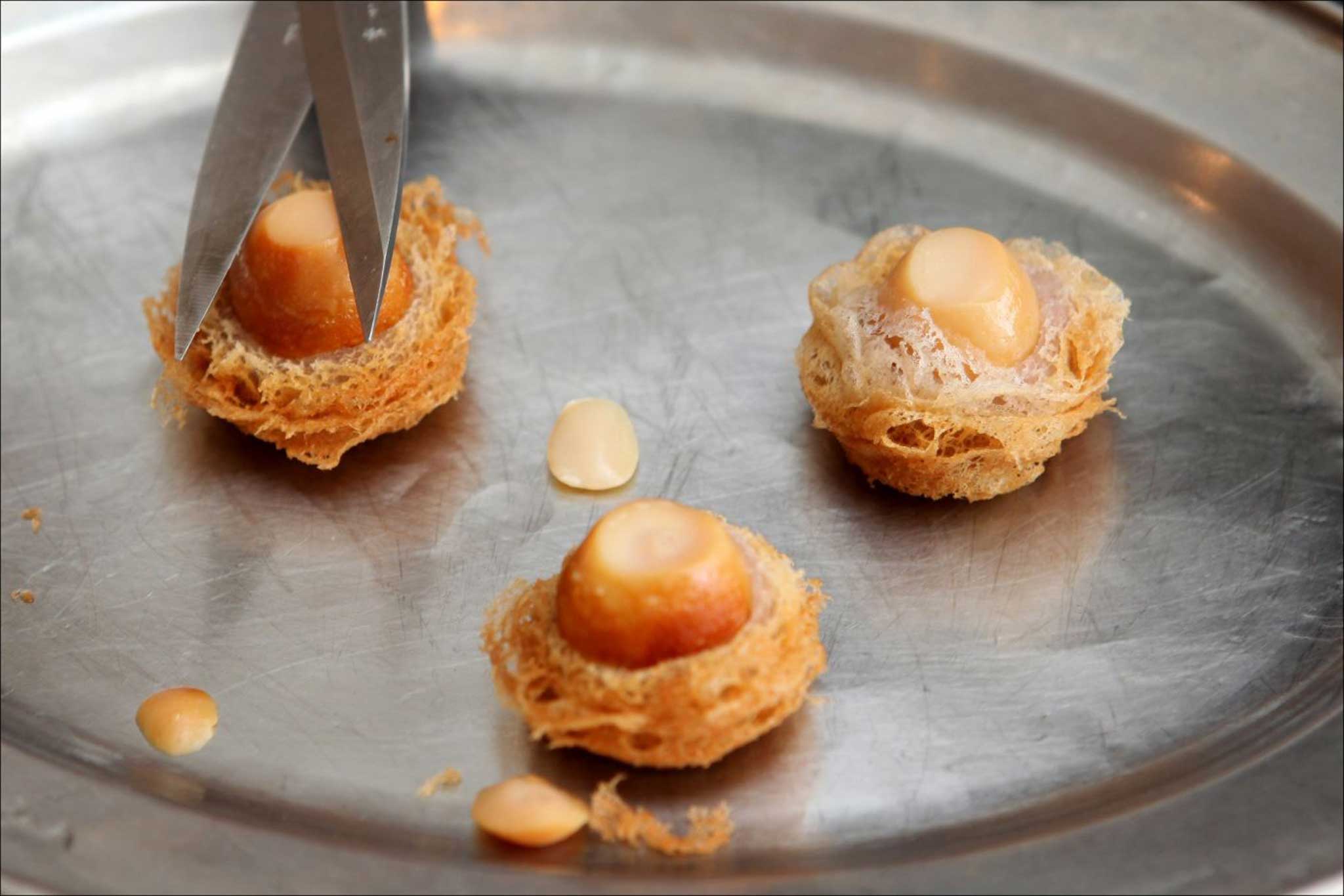 Ready, Leung lowers into boiling oil a smoked quail's egg which has been set in a ring of putty-like taro paste. The taro immediately puffs up to create a nest around the egg. He slides it onto a specially commissioned chrome tree before adding Chinese caviar and, using tweezers, a flake of gold leaf. "The bird's nest is very important in Chinese culture," he says. "It stands for family and unity."