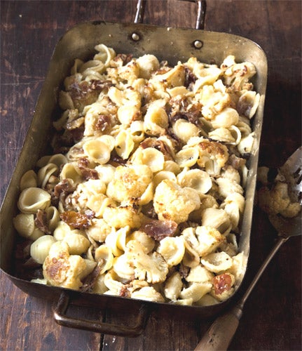 Orecchiette are little bits of pasta shaped like small ears ( orecche in Italian). You could substitute other pasta types, of course – farfalle (or bow ties) come straight to mind. The real stars of this dish are the garlic and cauliflower, roasted in a 9-by-13-inch baking pan until browned, caramelised, and utterly irresistible.