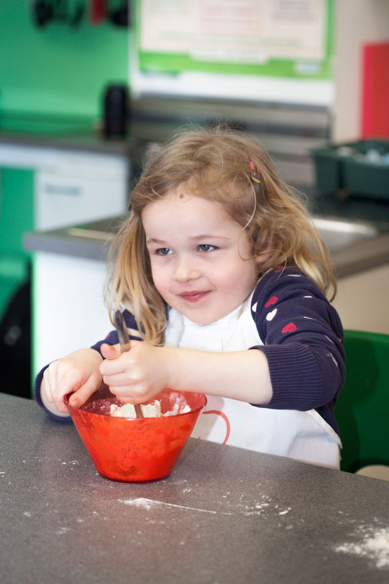 Older children learn lessons that cover different elements of nutrition – slow-releasing carbohydrates for energy; vitamins and minerals for the body's immune system. They learn about hygiene – why you don't lick your fingers then touch food – and techniques such as how to lay ingredients flat on a surface to chop them safely.