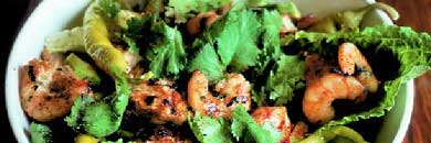 Thread the prawns and chicken separately on to metal skewers (the long Turkish ones are ideal). Cook the chicken first for 5-6 minutes on each side and the prawns for 2-3 minutes on each side. Arrange the lettuce on plates or in a large bowl with the avocado slices and chillies. Scatter the chicken, prawns and coriander on top and spoon over the dressing.