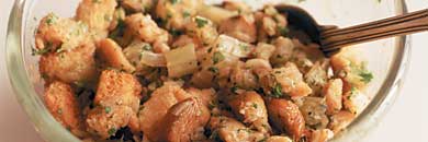 I was invited to my friend Anya's for a Thanksgiving Day meal last month, and she kept apologising about the stuffing for her turkey, which I thought tasted great. She explained that while she was trying to get the bread to dry to make breadcrumbs, she had left the cut pieces in the oven too long and they had become almost crouton-like. Here's her recipe.