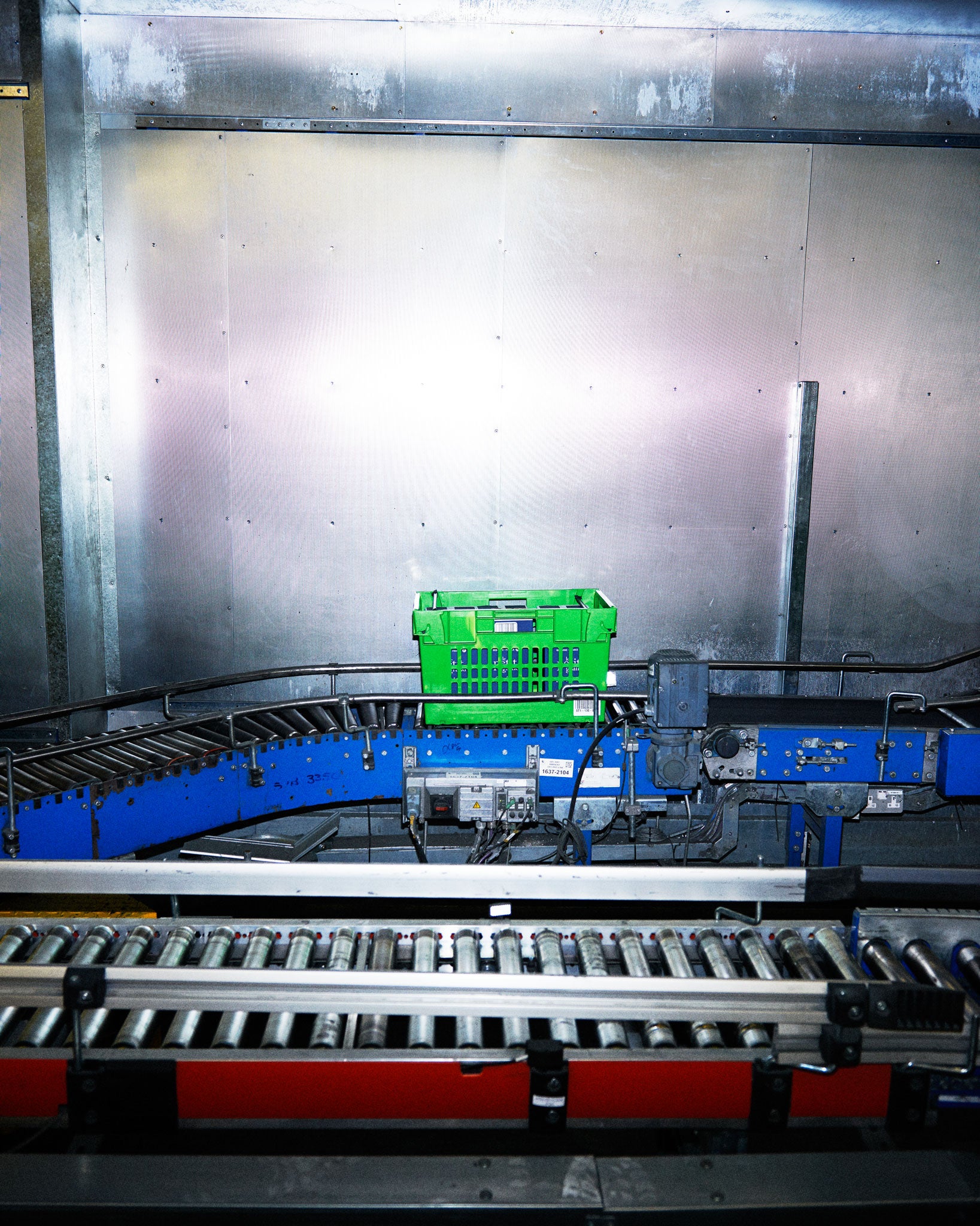 All around us, colourful plastic boxes – or totes – trundle by on hissing conveyor belts, sliding up and down slopes, taking corners, even scooting down a helter-skelter corkscrew. To evoke childhood Christmases past, it's like a mammoth Scalextric track looping round a Meccano set. I express an interest in getting inside a tote and going for a little ride around, but alas, no luck.