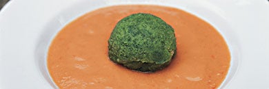Serve the gazpacho in chilled soup bowls with a scoop of sorbet in the middle and, if you've made them, the warm croutons scattered on top .