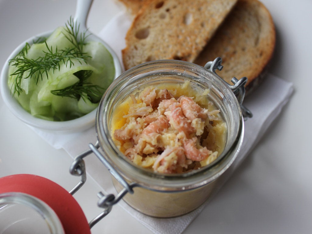 Recipes for potting the shrimp are as old as the hills – Florence White gives one dating back to the 18th century in her 1932 cookbook Good Things In England. It recommends melting shrimp and butter together in a low oven, while in the 19th-century Mrs Beeton advocated simmering the seafood for 15 minutes. Mark Hix keeps his off the heat altogether, simply adding the tiny crustaceans to warm butter infused with spices.