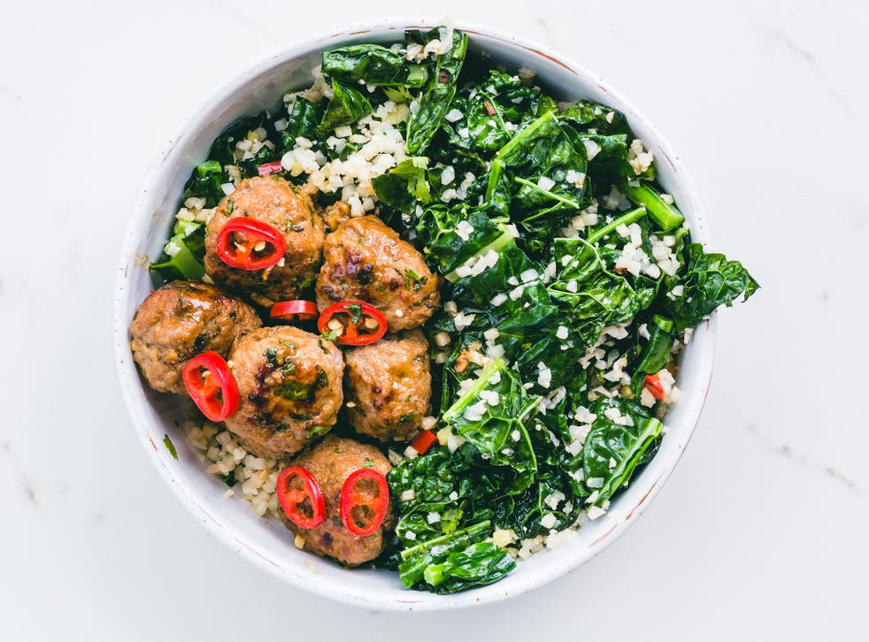 These pork meatballs have a wonderfully satisfying umami richness. They’re served with the dark, leafy kale, a nutritional powerhouse that contains more antioxidants than most other vegetables