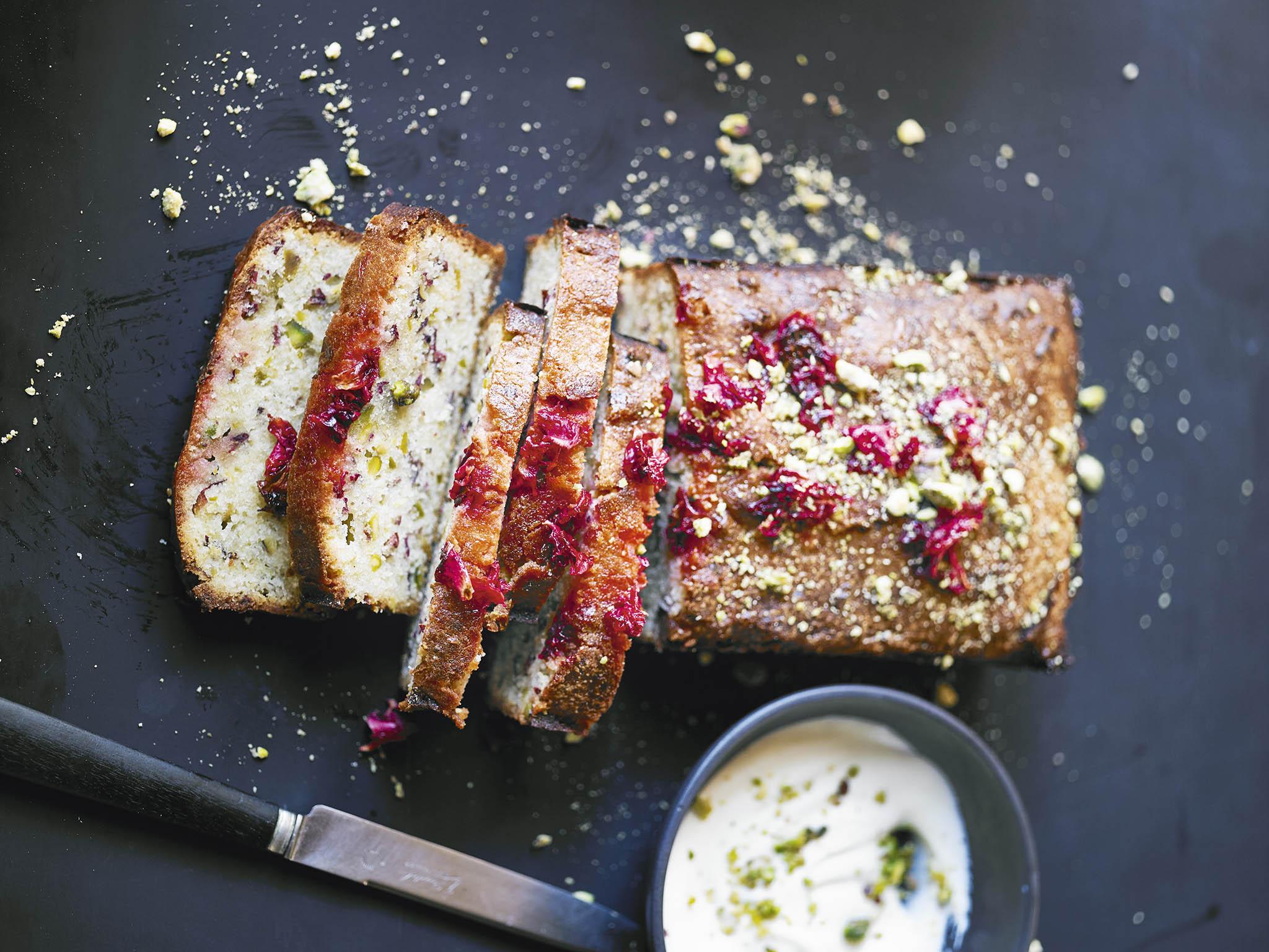 Mix together the flour and rose petals. Reserve 1 tbsp chopped pistachios and add the rest to the flour, then stir into the creamed mixture. Add the lemon juice and gently mix to combine. Spoon into the prepared tin and bake for 40-45 minutes until golden and a skewer inserted in the centre comes out clean.
