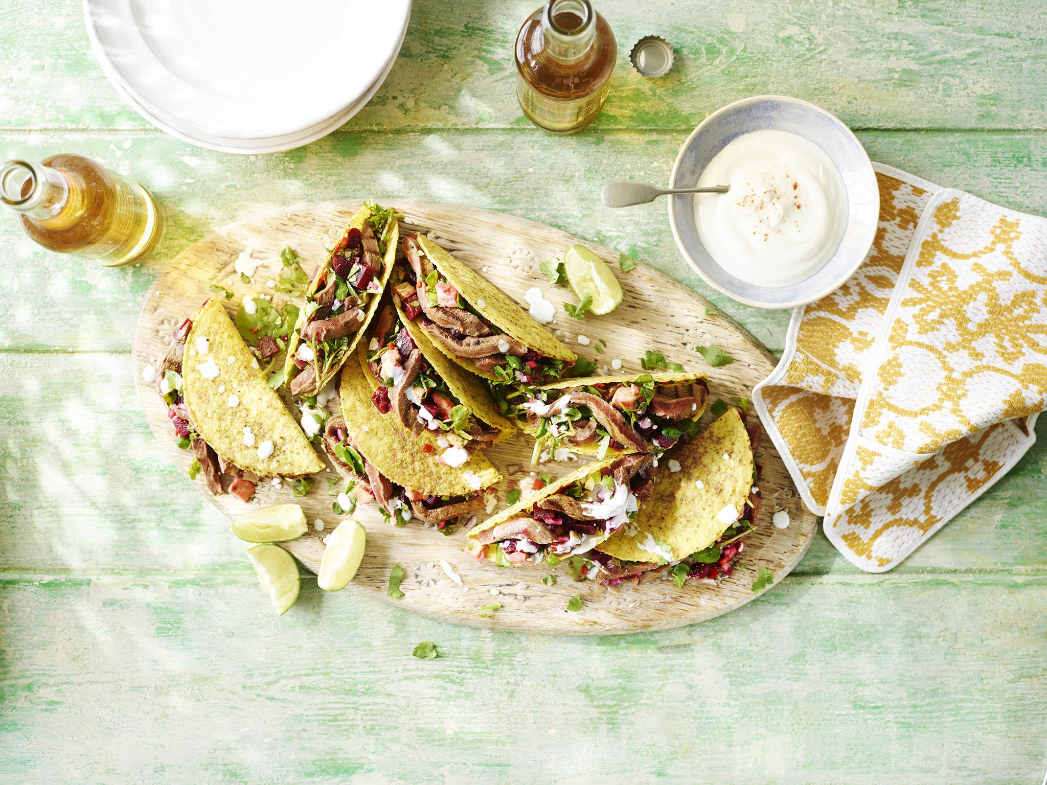Beef and avocado tacos are classic Mexicana – but ring the changes with beetroot salsa and a surprising maple glaze