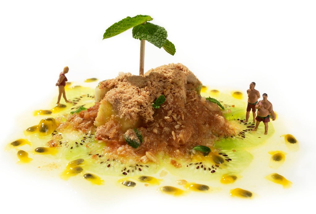 5. Pile the syrup fruit on the plate. Finely slice the rest of the kiwi and lay around the edge of the pile. Spoon over a generous helping of sand. Drizzle the syrup mixture around the island.