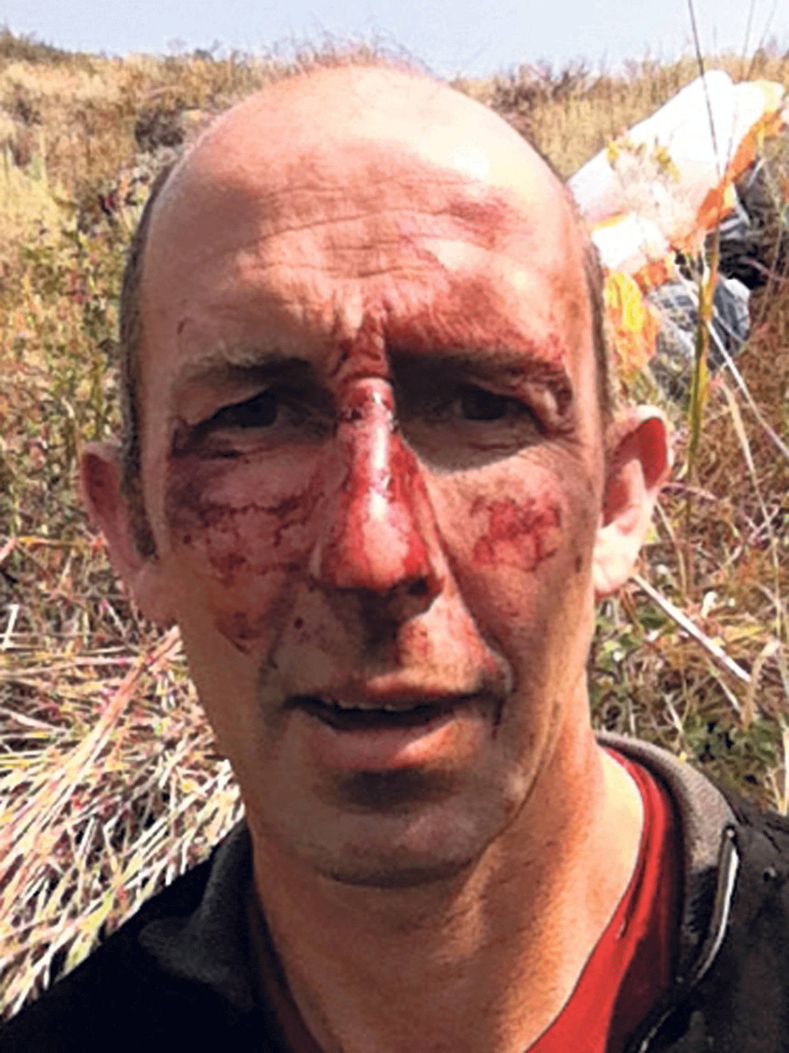 Blood was pouring out of his head; he took a photo with his phone (he had no signal) and saw a cut on his nose from the sunglasses. His left arm seemed to be broken and he could not twist round, suggesting his ribs were broken too.