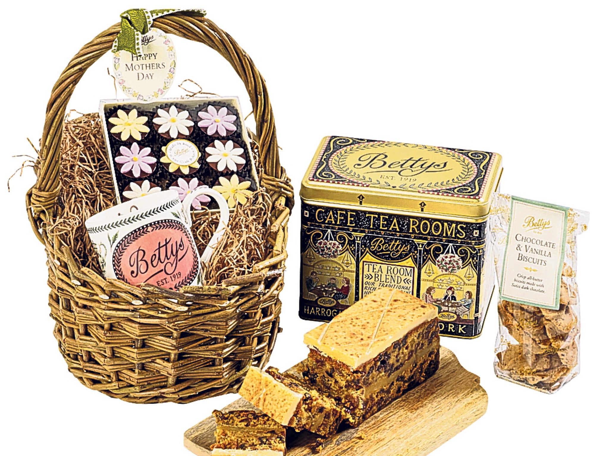 This handmade Yorkshire willow basket contains a feast of goodies, all made with mothers in mind and with a lovely seasonal focus. They include dark chocolate fondants with spring flowers, tea bags and a posh mug, chocolate and vanilla biscuits and Bettys' unbelievably scrumptious simnel cake.
