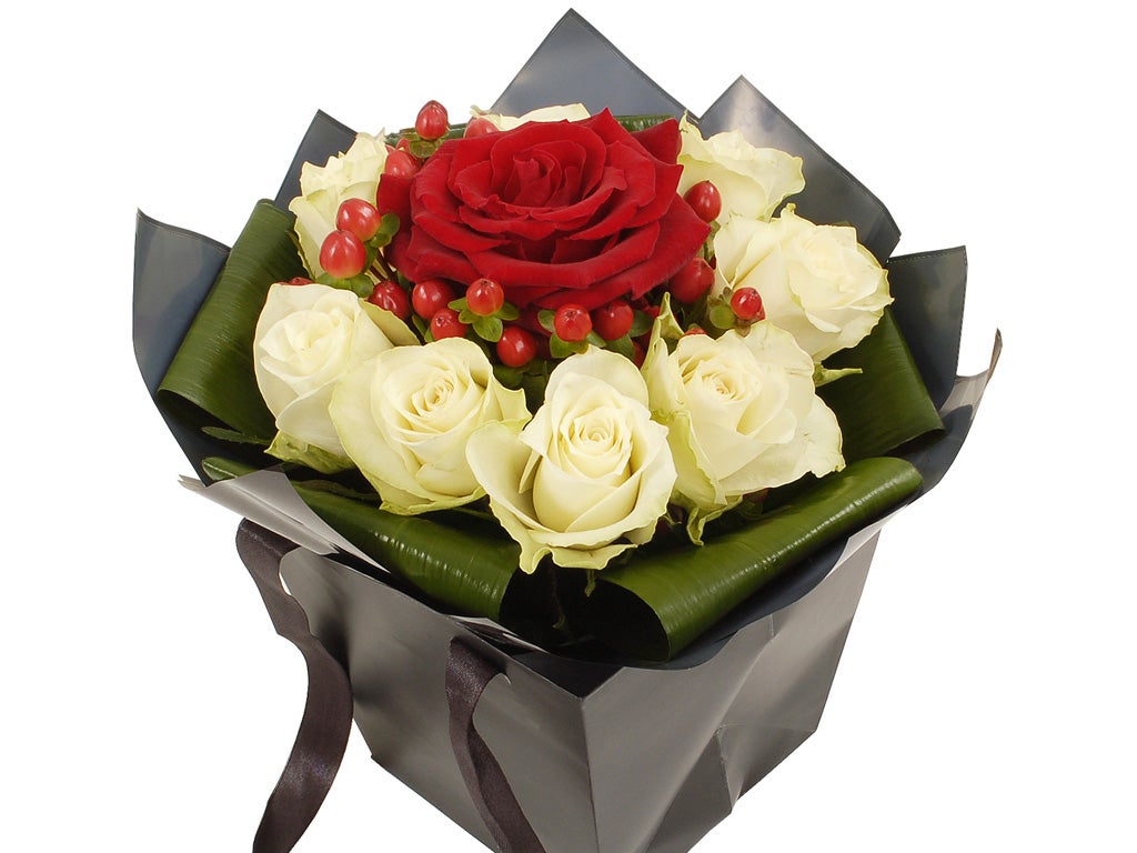 Say it with flowers. Unlike your normal blooms, 20 per cent of the cost of this next-day-delivered white and red rose arrangement goes to Cancer Research UK.
