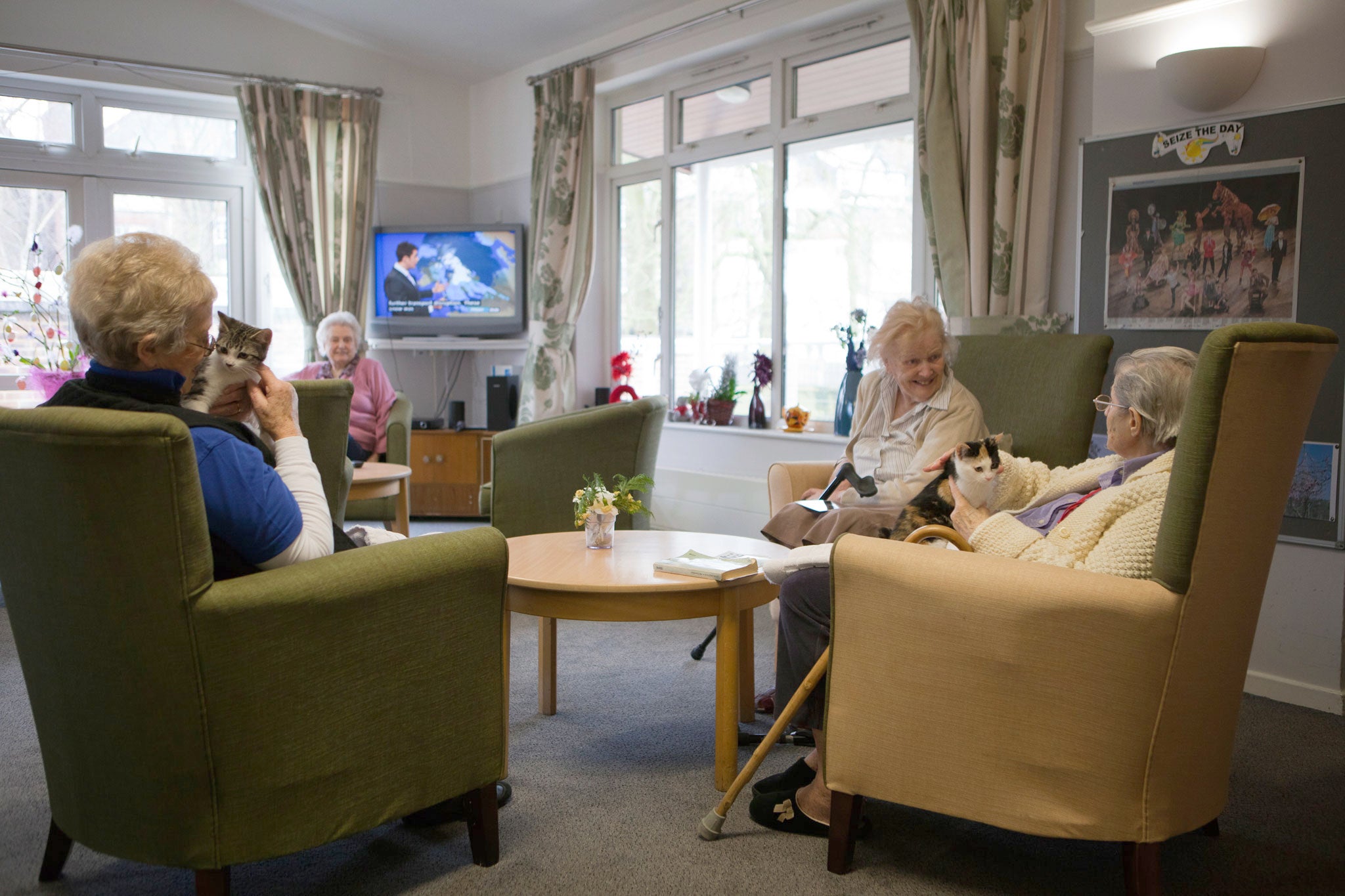 "It's all about enriching the residents' lives," says Sarah Dickinson, the Mayhew's communications manager, as she keeps one wary eye on Stan and Ollie and the nine (mostly female) Elgin residents who have gathered. "A lot of the people we visit have dementia and Alzheimer's, which can lead to them becoming isolated. But you can see how lively the room becomes, because everyone's excited about the animals coming and about seeing the volunteers. They're not just sitting in their own living areas, or sitting round watching the television."