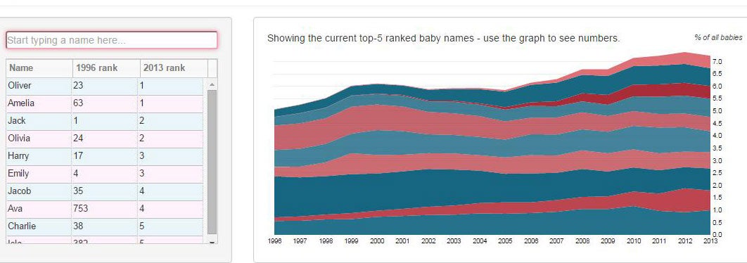 Search for names in the box on the left hand side to view their changing popularity by year and percentage.