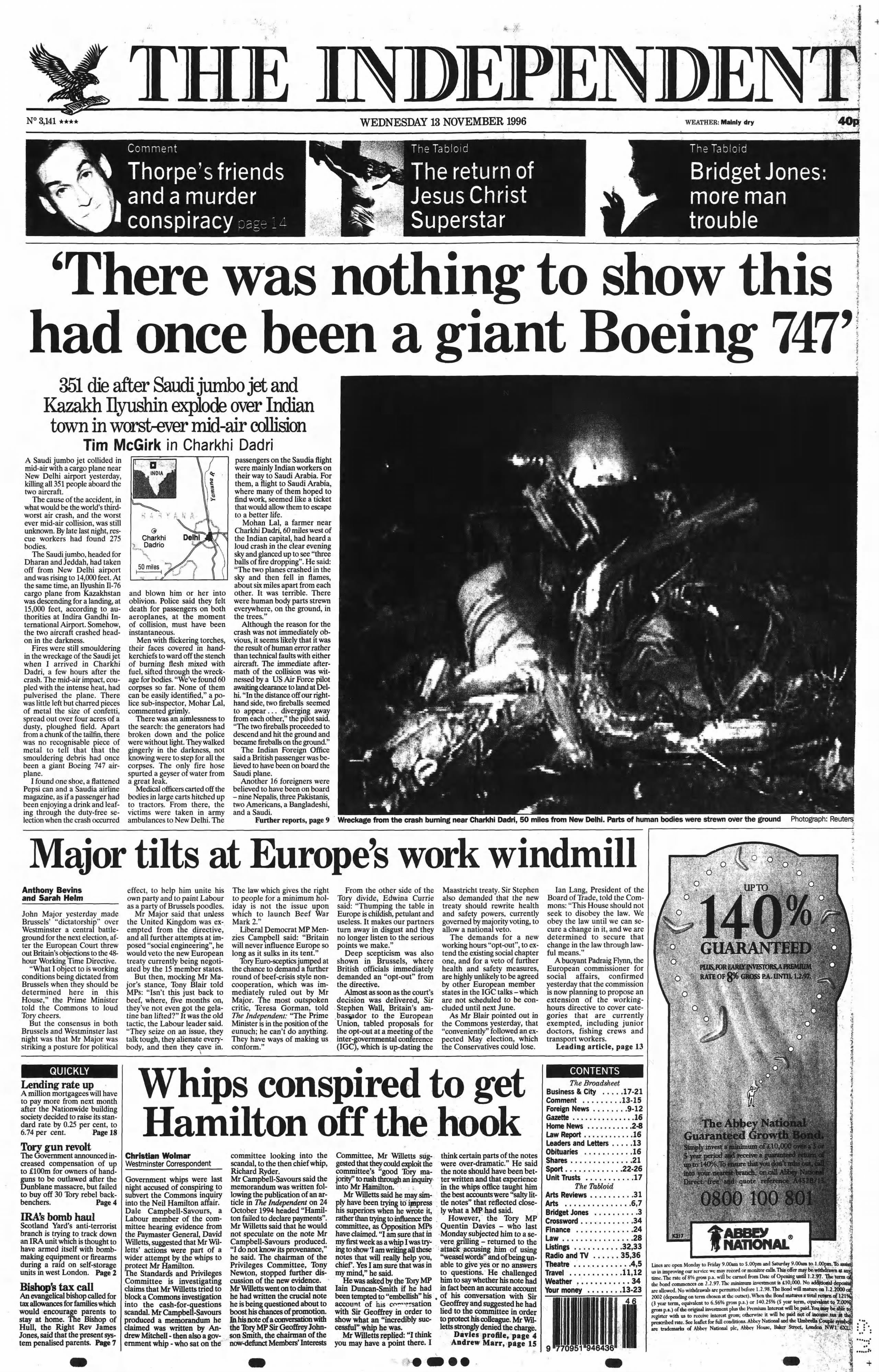 A mid-air collision near New Delhi between a Saudi Boeing 747 and a Kazakhstan Airlines jet kills everyone on board. One of the deadliest aviation disasters in history, the horrific crash leads to major reforms in international air traffic control.