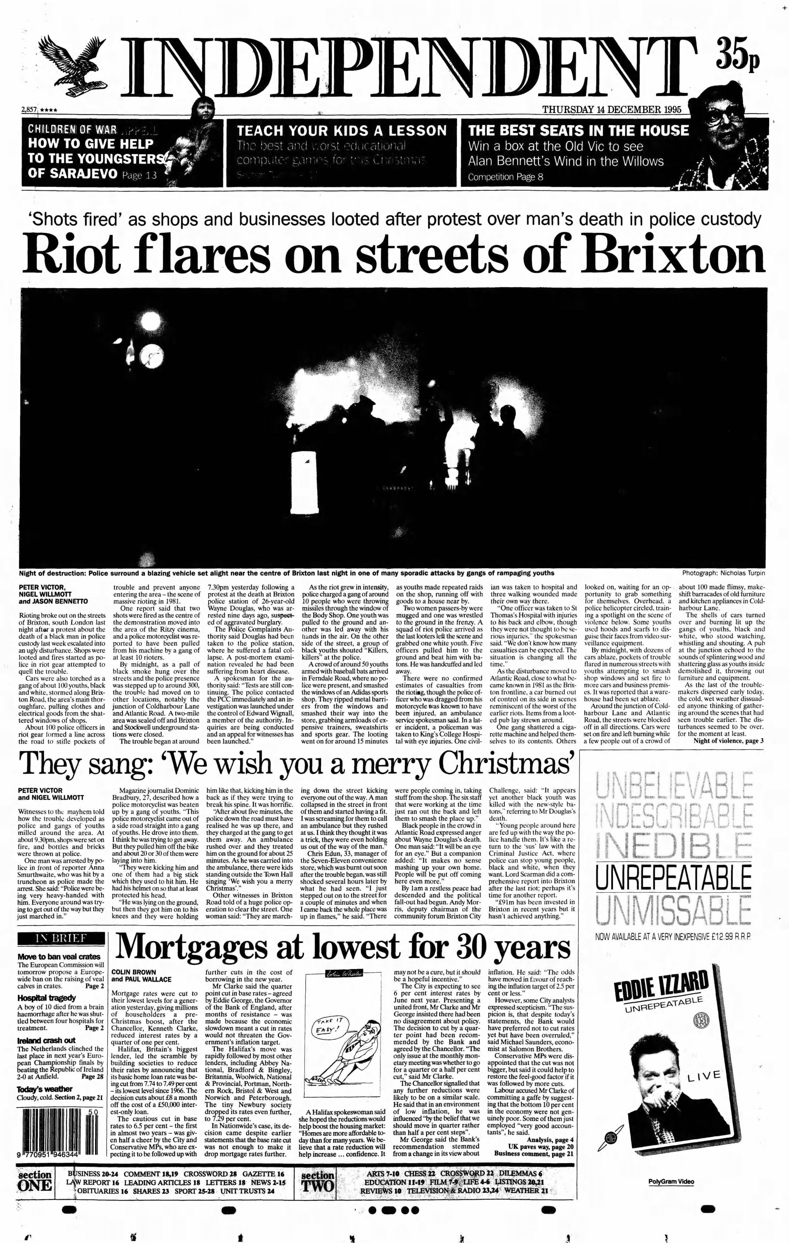 Unrest breaks out in Brixton after 26-year-old Wayne Douglas dies while in police custody. Five hours of clashes follow across the area. The Independent reports on renewed tensions between officers and residents, coming just over a decade after the 1981 riots.