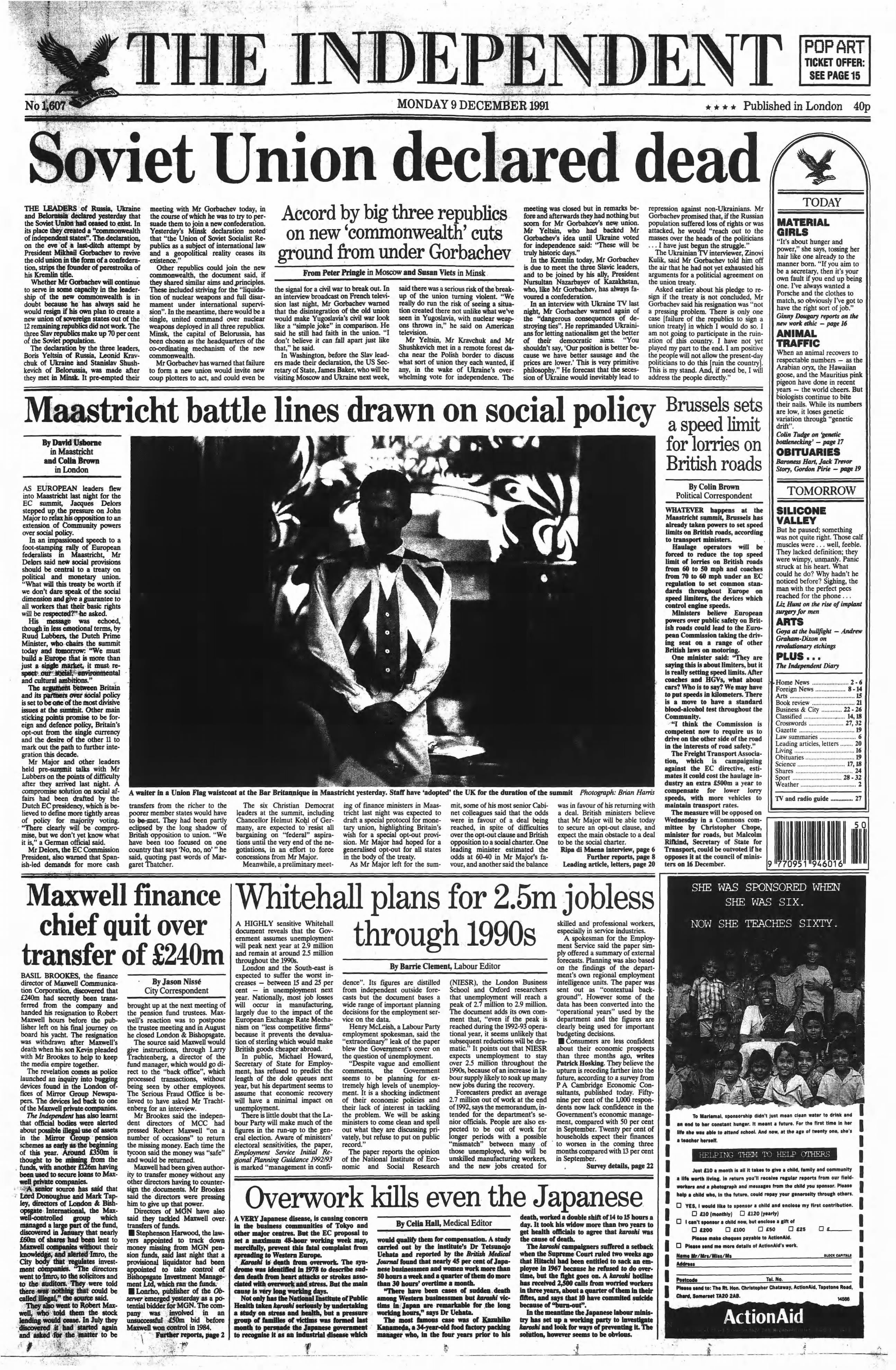 Leaders of Russia, Ukraine and Belarus sign the Belavezha Accords, declaring the Soviet Union dissolved and creating the Commonwealth of Independent States in its place. The agreement signals the formal end of the USSR after months of political crisis and the failed August coup, leaving Mikhail Gorbachev without a state to lead.