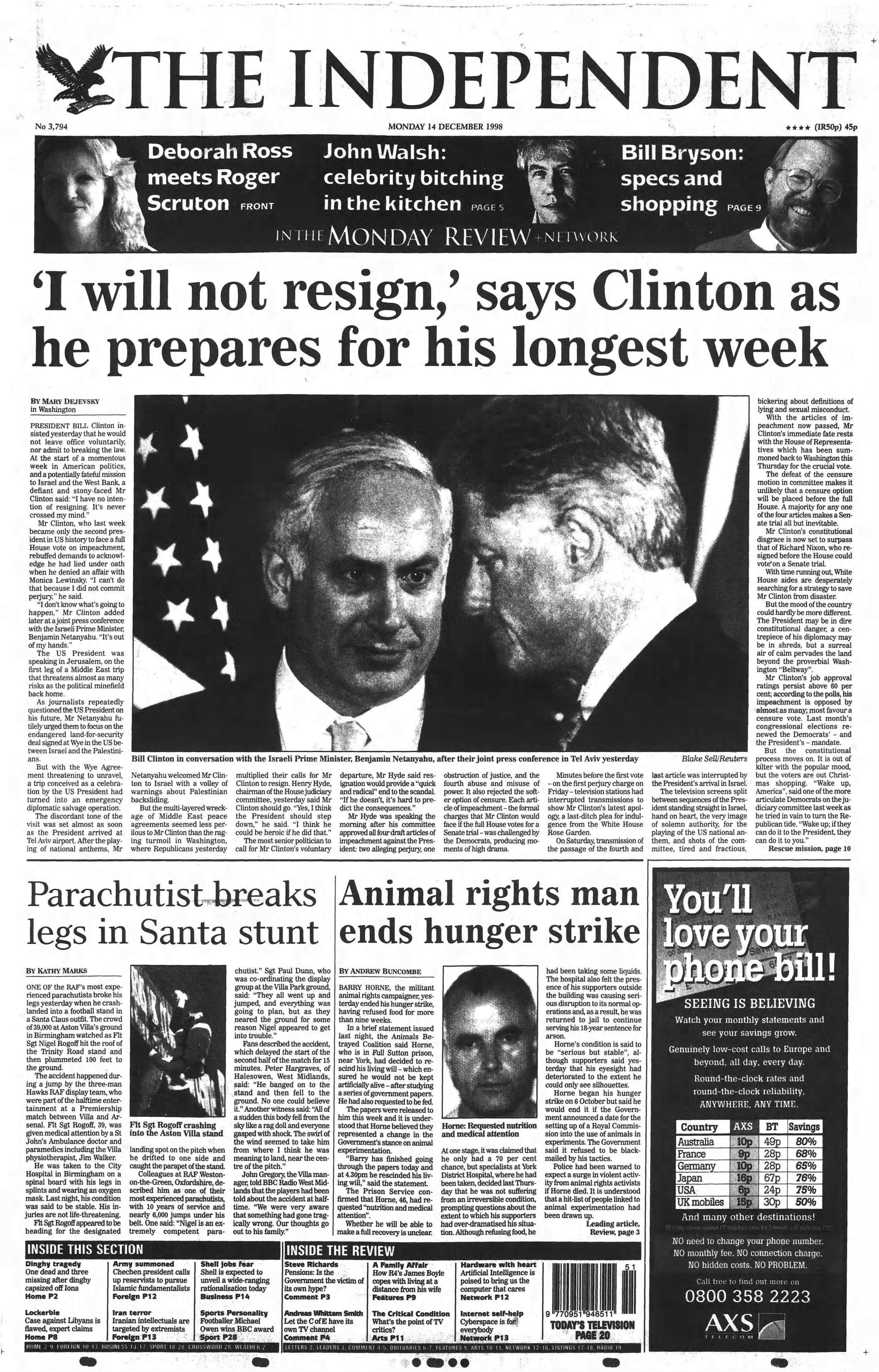 President Bill Clinton insists he will not resign as he faces a full House vote on impeachment. Speaking at the start of a high-stakes visit to Israel and the West Bank, he rebuffs calls to admit he lied under oath about his relationship with Monica Lewinsky. “I don’t know what is going to happen,” Clinton says at a joint press conference with Israeli prime minister Benjamin Netanyahu, as political pressure intensifies in Washington.