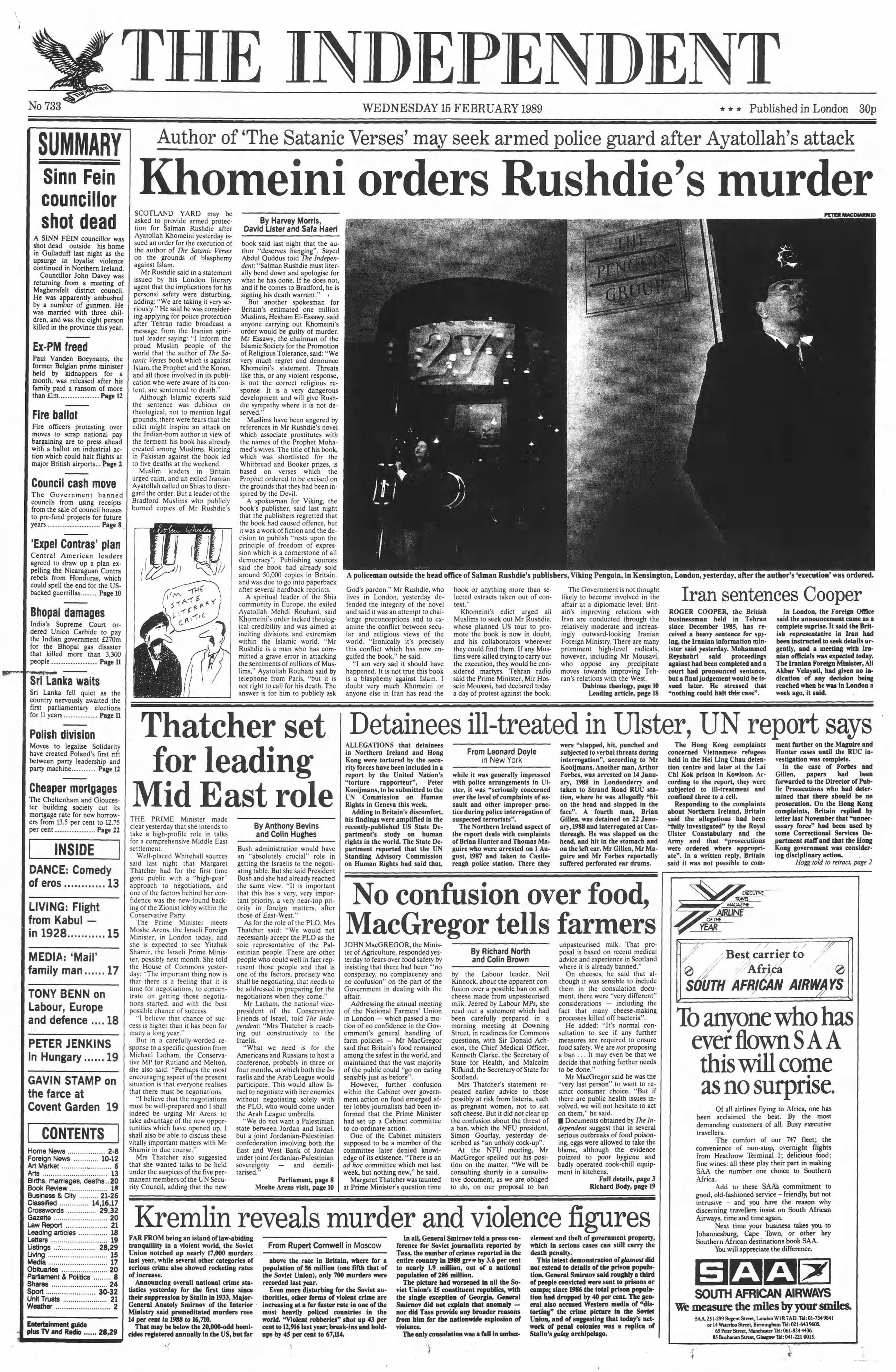 Iran's supreme leader Ayatollah Khomeini calls for the death of novelist Salman Rushdie over The Satanic Verses, forcing the author into hiding and prompting discussions about his police protection in Britain. Tehran radio broadcasts the declaration: “I inform the proud Muslim people of the world that the author of The Satanic Verses book which is against Islam, the Prophet and the Koran, and all those involved in its publication who were aware of its content, are sentenced to death.” The Iranian leadership would eventually make the call to distance itself from the fatwa nearly 10 years later in 1998.
