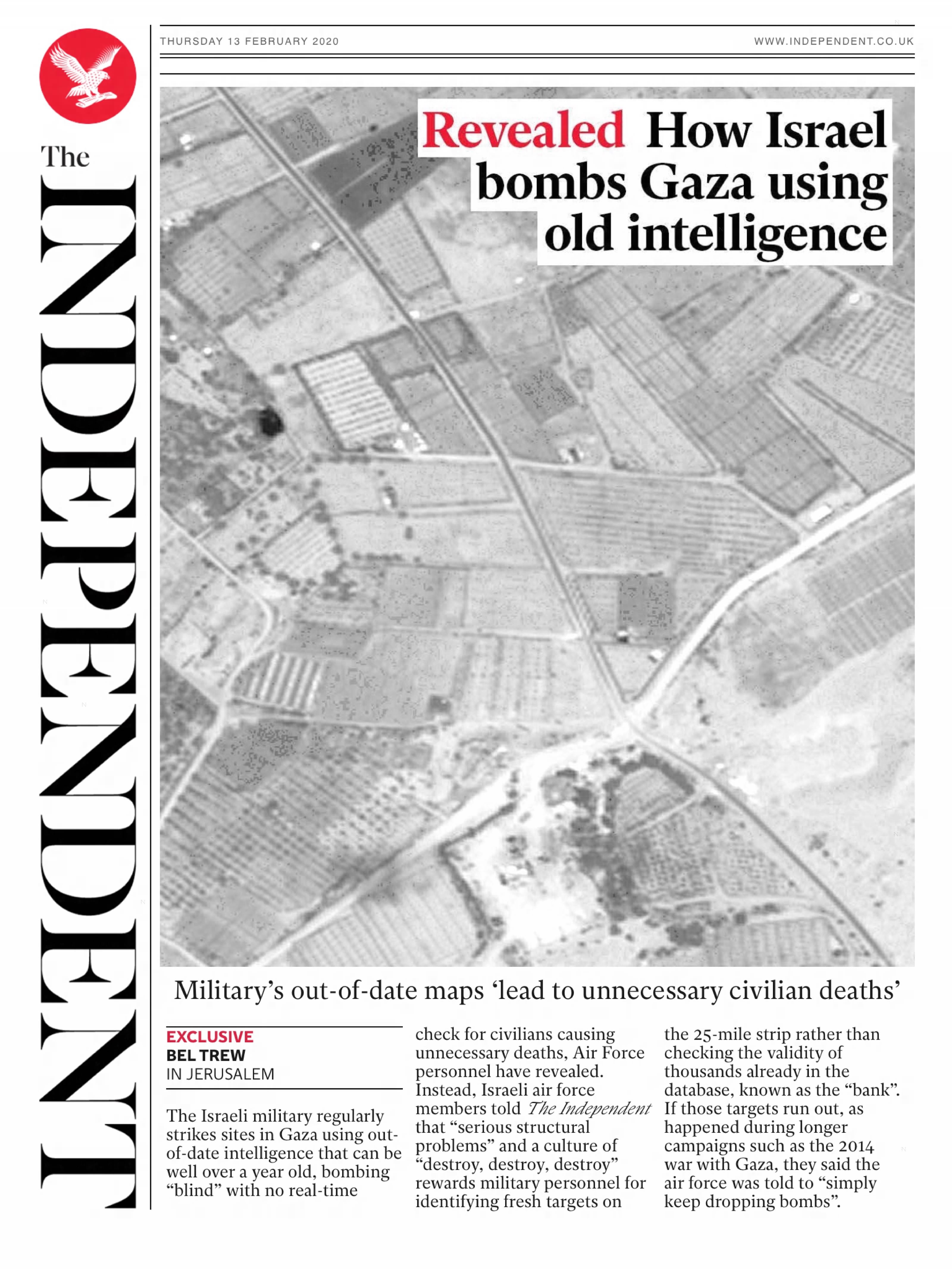 The Independent features a front-page investigation reporting that Israeli air strikes on Gaza were carried out using outdated intelligence. Testimony from Israeli Air Force personnel describes serious structural problems and a culture of “destroy, destroy, destroy”, which they report led to unnecessary civilian deaths. The investigation adds to longstanding scrutiny of military conduct in Gaza and foreshadows similar criticisms raised during later rounds of air strikes post-October 7th.