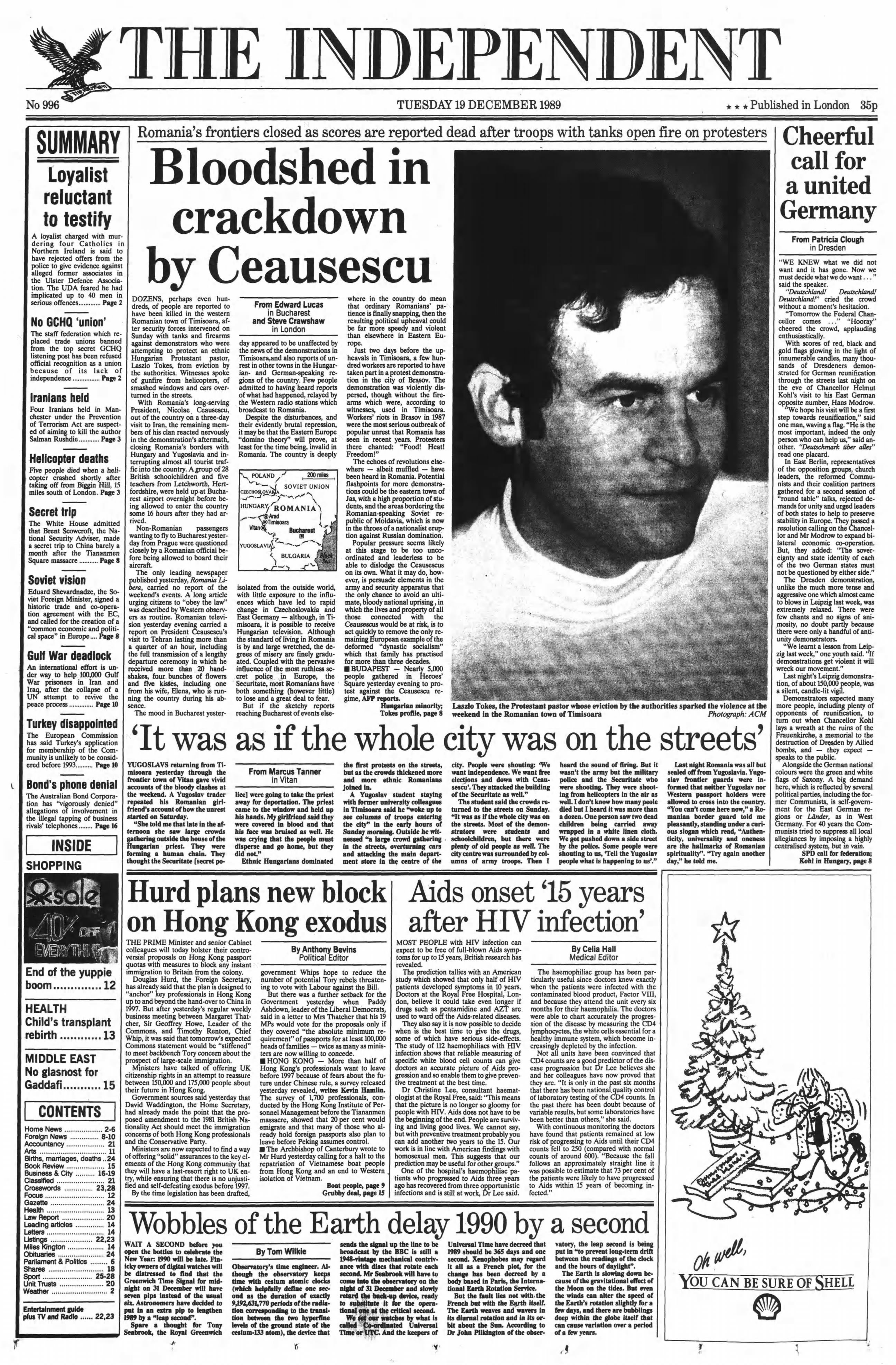 Clashes in Timișoara mark the beginning of Romania’s violent uprising against Nicolae Ceaușescu. The Independent reports claims of mass casualties following the use of tanks and live fire against demonstrators, as the regime begins to unravel.