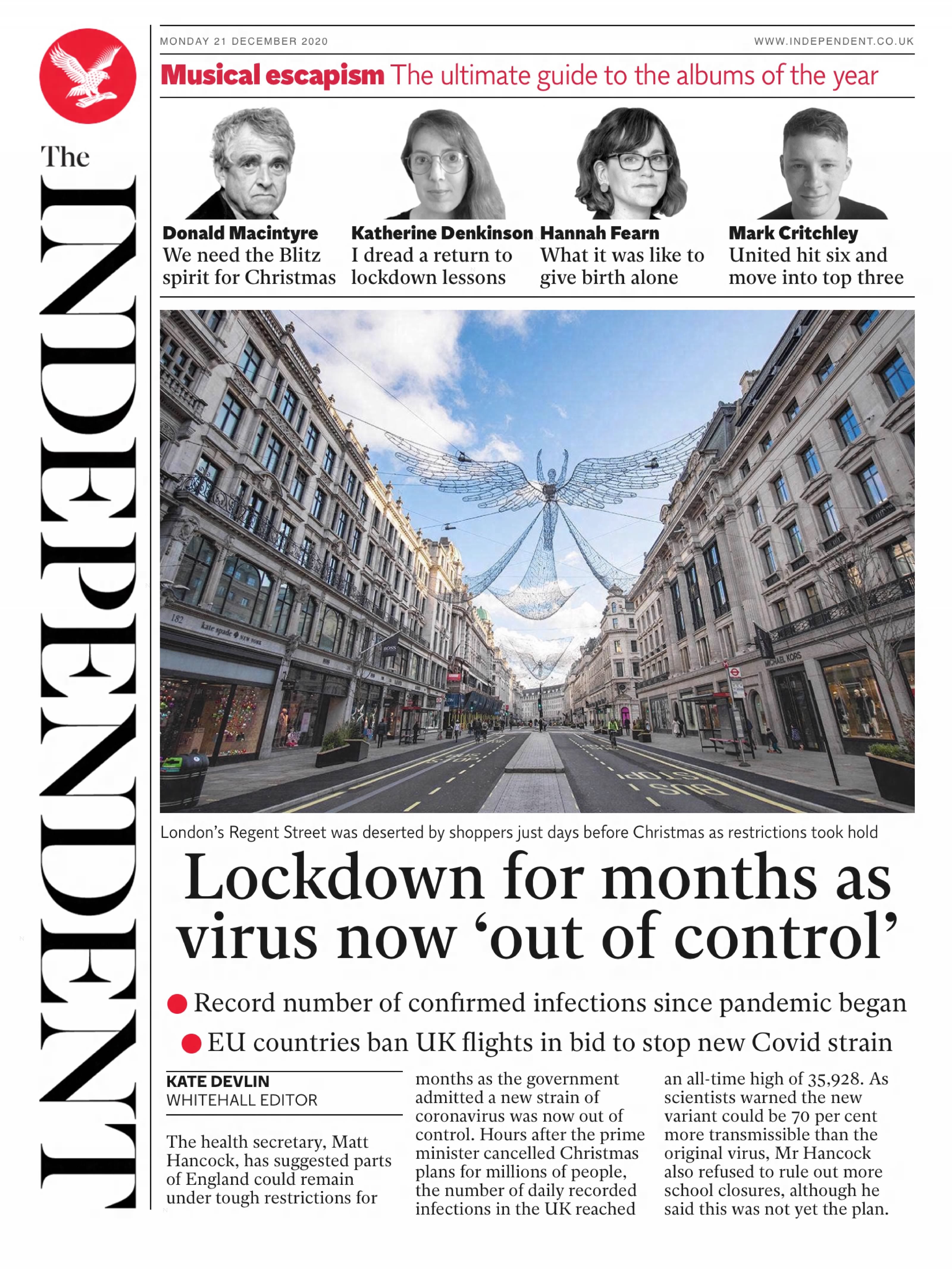 Britain enters a grim new phase of the pandemic as record numbers of Covid-19 infections are confirmed and a new variant is identified. The Independent shows a deserted Regent Street, emblematic of life under tightening restrictions, as international flights from the UK are suspended and fresh lockdown measures loom.