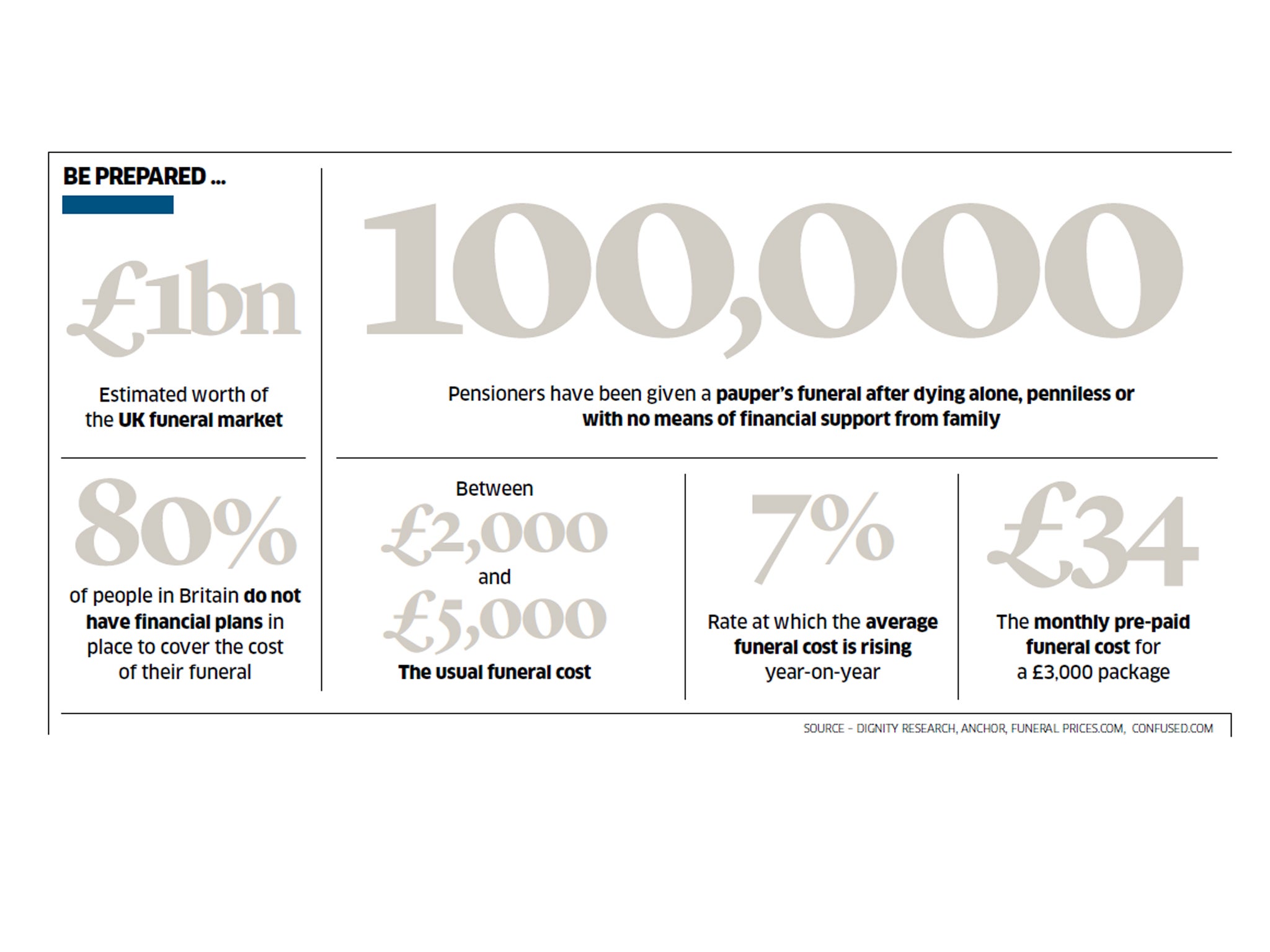 With the average funeral now costing between £2,000 and £5,000 – and rising at 7 per cent year on year – it is certainly worth considering planning ahead. But, according to new research from Confused.com, 80 per cent of Britons have no financial plans in place to cover their send-off, thus risking following the 100,000 people who were given a pauper's funeral in the past five years after dying alone, penniless or with no financial support from their families.
