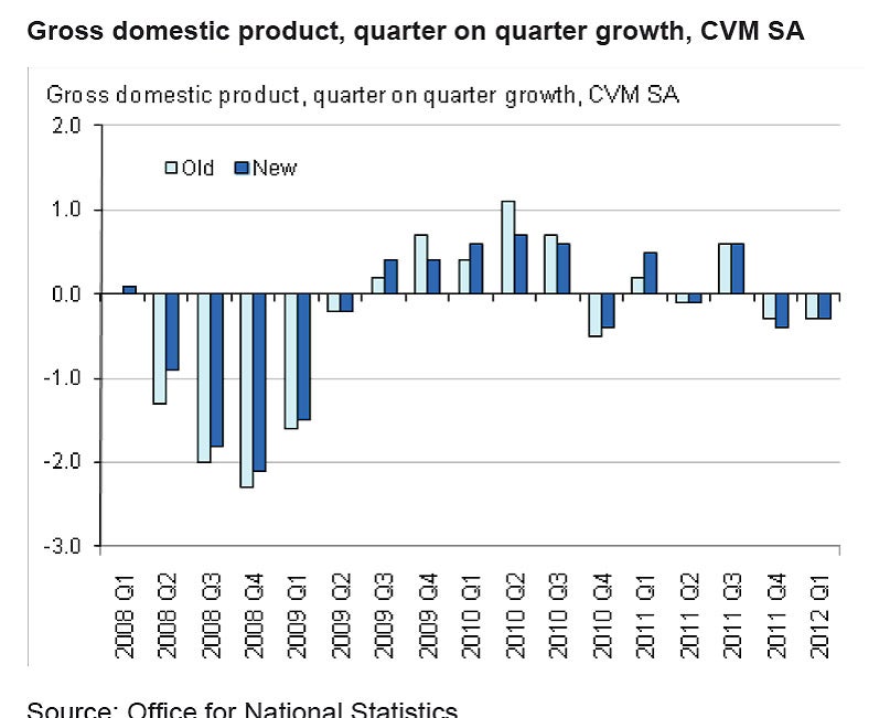 The latest revisions to GDP out last week indicated that the 08-09 recession was not as deep as had initially been believed, which is what the Monetary Policy Committee had been saying, so power to them for that. This is illustrated in the other chart above. But recovery since then has been slower and more prolonged. The ONS confirmed that output in the first quarter fell by 0.3 per cent, but the extent of the decline in the final quarter of 2011 was revised down from -0.3 per cent to -0.4 per cent, confirming we are in an even deeper double-dip recession than was previously thought. The recession deniers have gone quiet again.