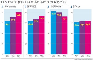 Looked at in a global context these changes are quite small. For example the fact that India is likely to pass China as the world's most populous country in about ten years time dwarfs these modest population shifts within Europe. Nigeria is projected to top 400 million by 2050; Pakistan will be well over 300 million. By contrast Japan will decline from its present 127 million to 95 million. But from our own narrow perspective there are some obvious consequences.