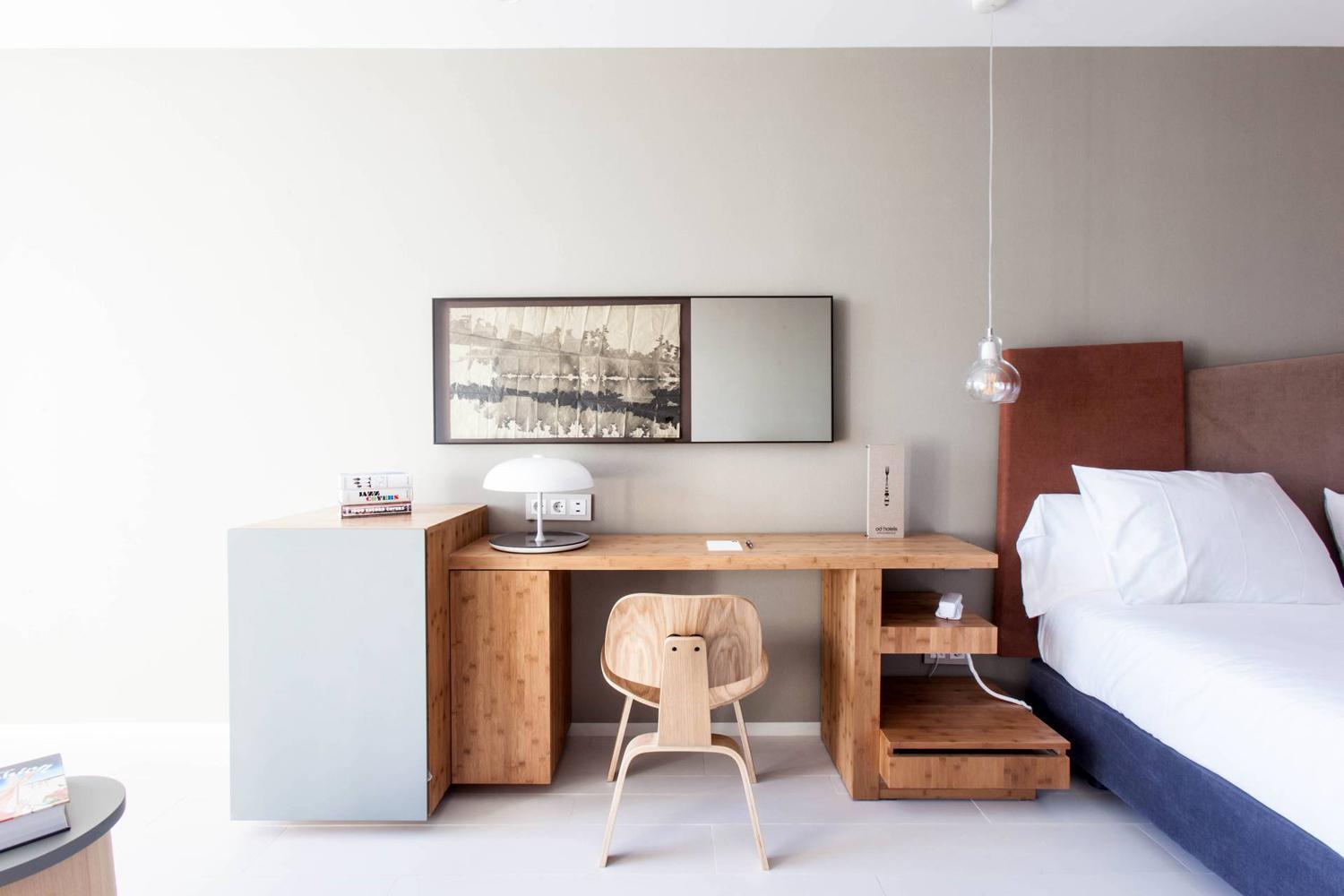 A Mediterranean blue theme runs throughout. Modern furnishings, made bespoke for the hotel, such as Eames or Arne Jacobsen style chairs, wooden stools with colourful tops, low hanging lighting and comfortable beds with statement headboards would not look out of place in Scandinavia.