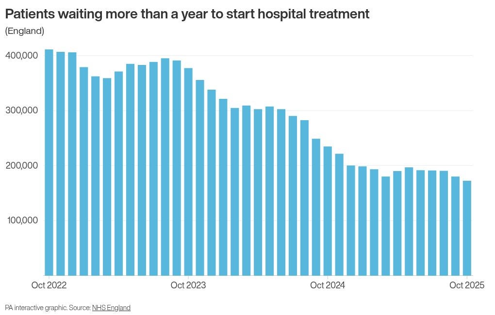 The data also shows the waiting list for planned hospital treatment in England has risen slightly to 7.40 million treatments waiting to be carried out at the end of October, up from 7.39 million at the end of September.