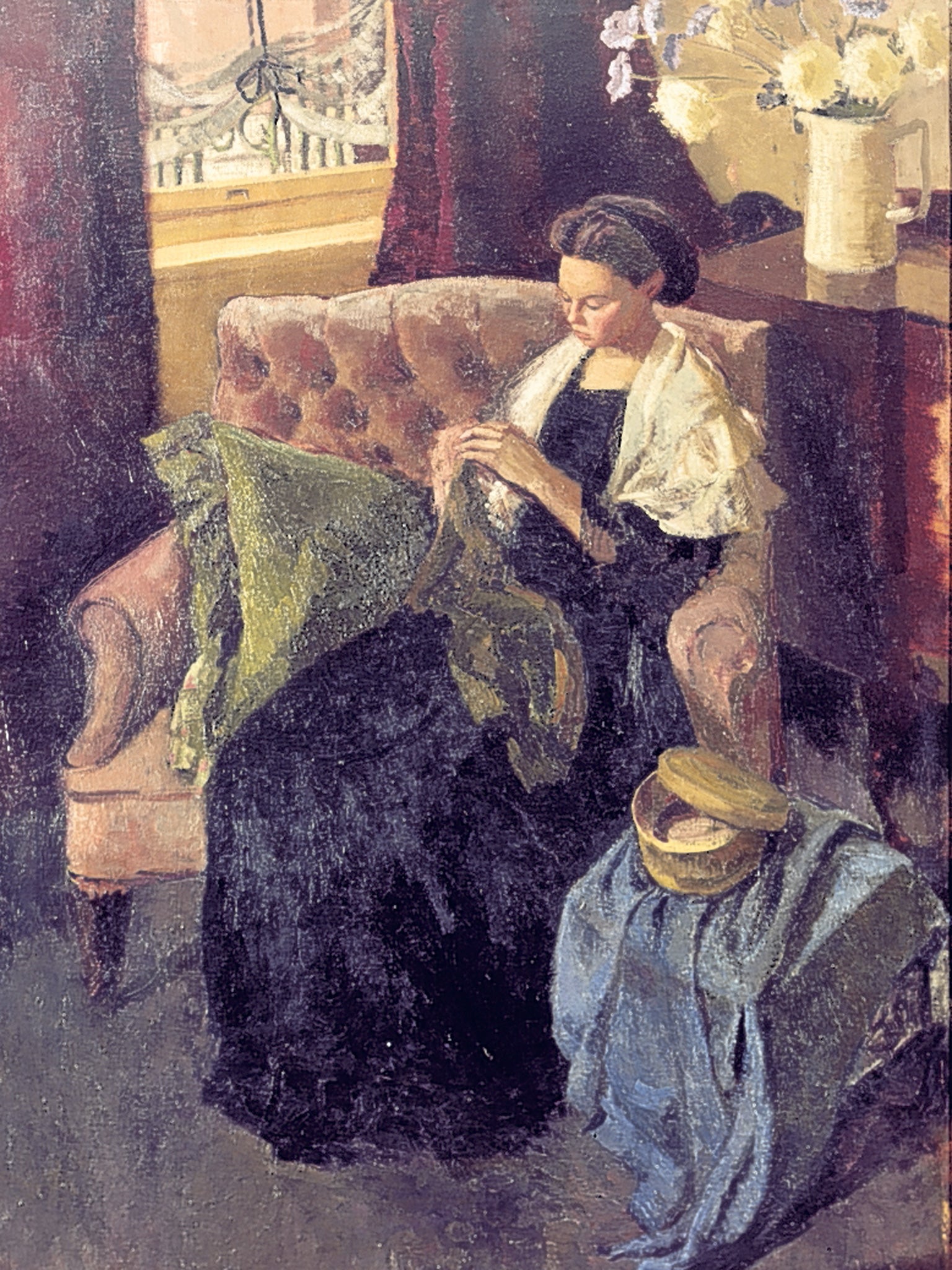 Her attempt to enter art school was made with drawings of Garbo, Joan Crawford and some of her brother sitting in an armchair. Professor Randolph Schwabe's gruff evaluation was that since the latter were from life they made her an acceptable candidate. In fact she drew so well that she stood out a mile. She was first to be awarded the Ida Nettleship Scholarship, for Domestic Employment (pictured right), a painting of her fellow student Dodie Masterman sewing.