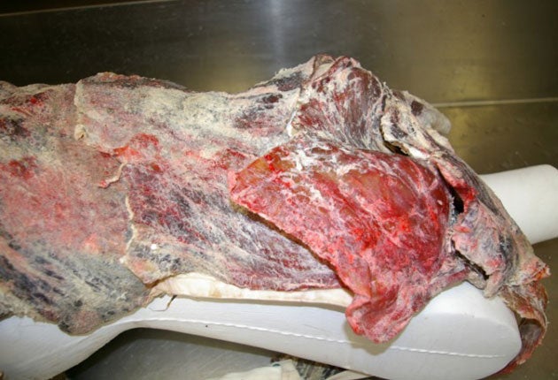 Layers of fat on the garment, which it was impossible to prevent rotting, were recreated from rubber. The painstaking job of rebuilding it, using fishing nylon to stitch the preserved meat on to a corset just as Fernandez had done, took months. "When I first opened the dress up, it was disgusting," he recalls. "I had to ventilate everything. They were lucky no flies had laid eggs, because it would have had maggots. The oxidation from the air had made it blue. I spent six weeks just killing bacteria."