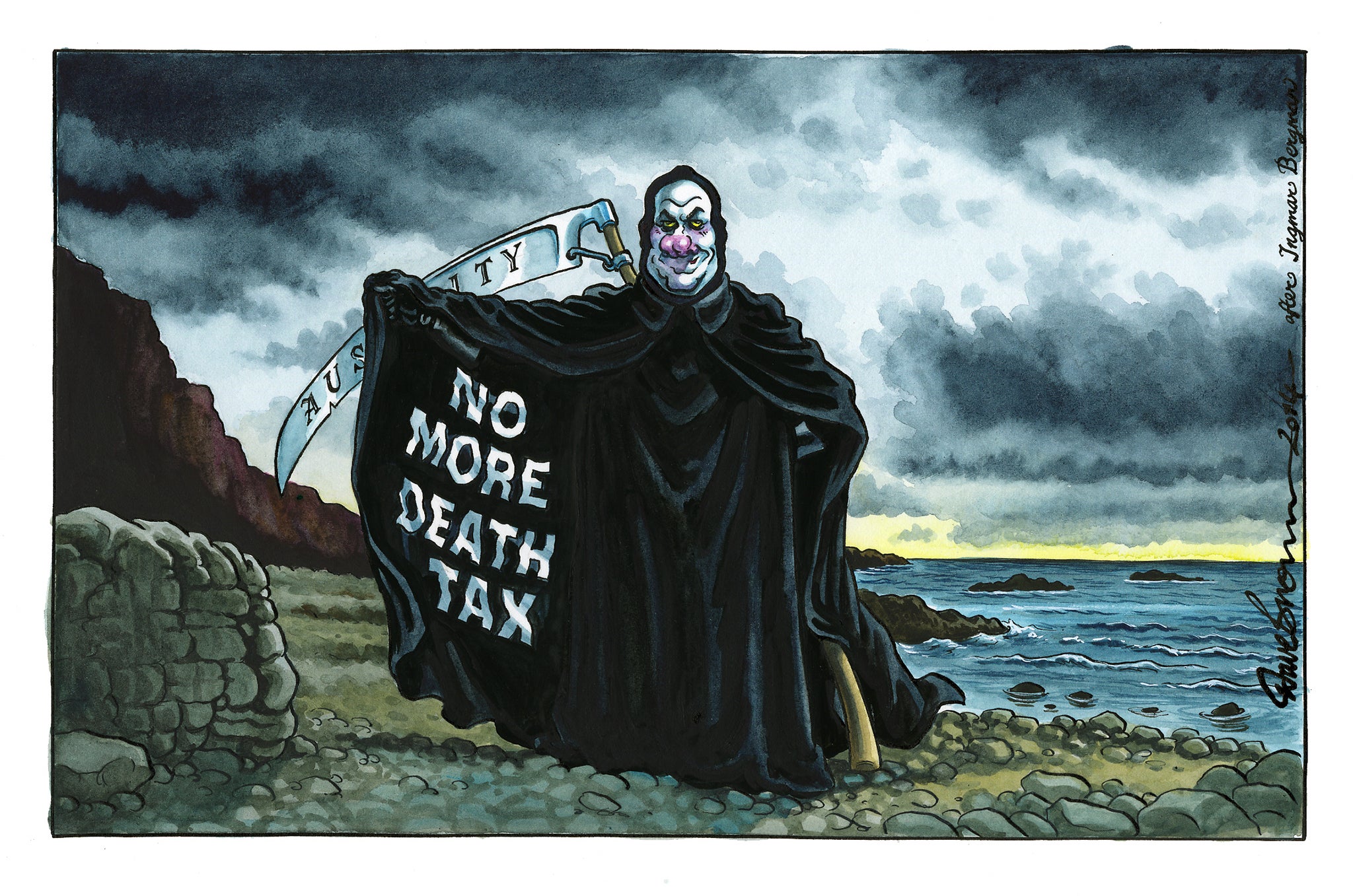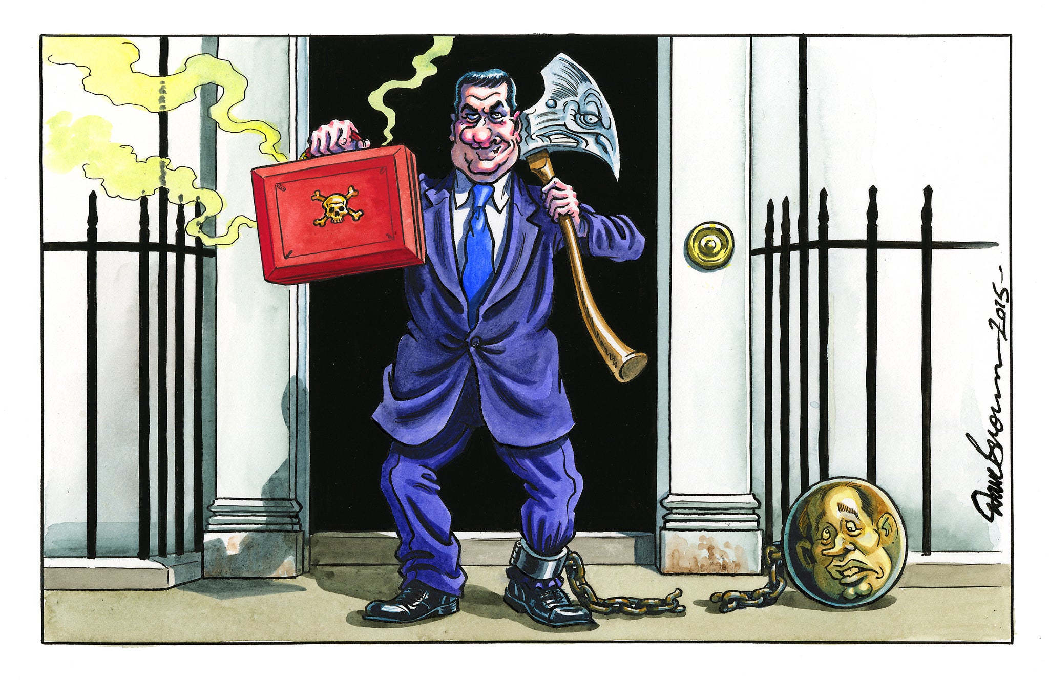 Government cuts have been a theme of the past six years, and as the man doing the cutting, George Osborne tends to emerge as the most villainous of all Dave Brown’s characters. Swords, axes, and knives are to the fore, and nothing Dave has done is better than the Chancellor as the Grim Reaper, his scythe barely concealed.