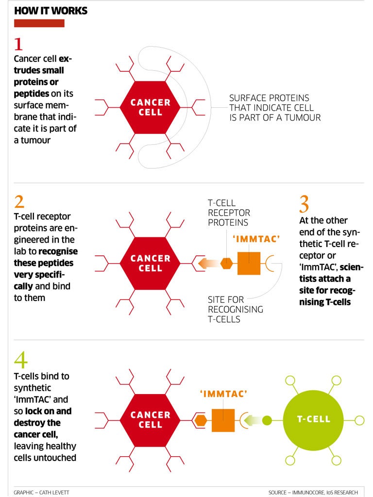 Immunocore has found a way of designing small protein molecules, which it calls ImmTACs, that effectively act as double-ended glue. At one end they stick to cancer cells, strongly and very specifically, leaving healthy cells untouched. At the other end they stick to T-cells.