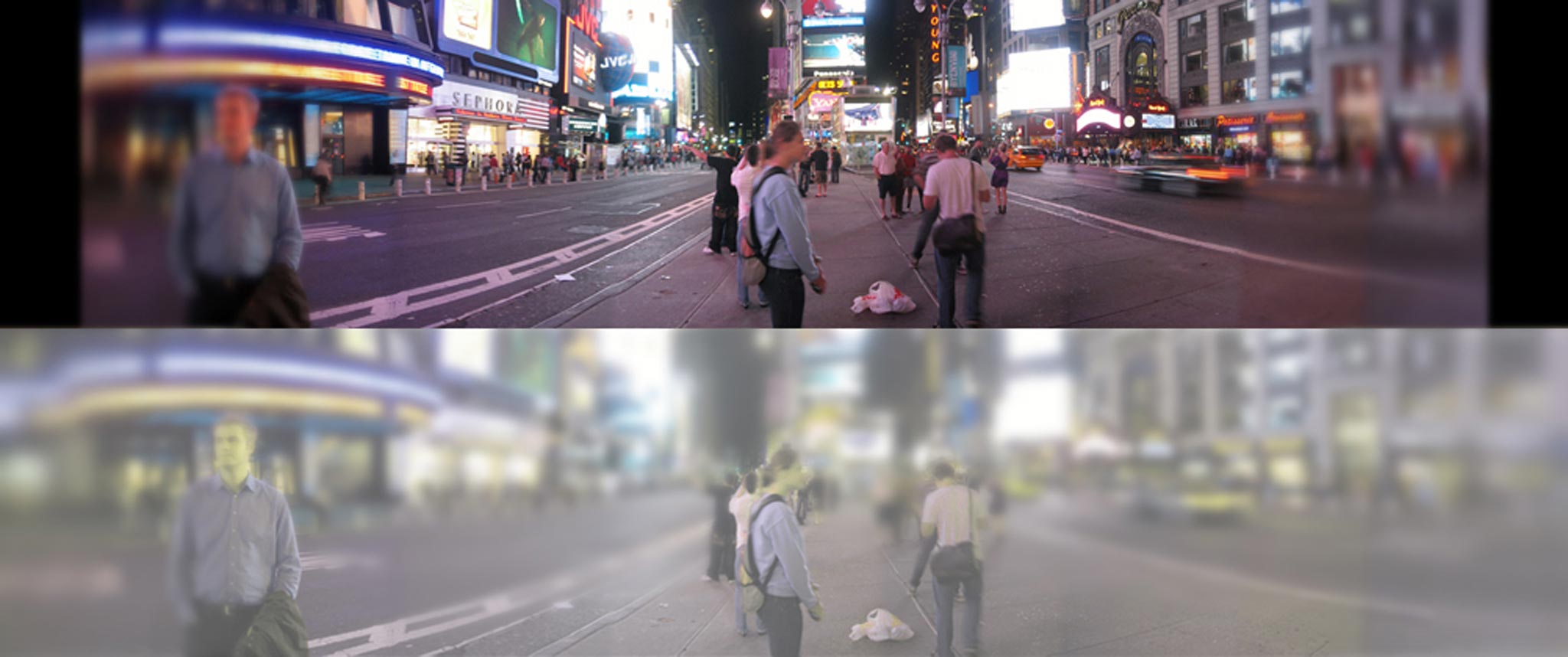While the shape of our retinas enhances our ability to see different colours during the day, it limits our vision in dim light unlike cats whose sight excels under these conditions. In fact cats can see six to eight times better in dim light than humans because of the shape of the retinas, their elliptical pupils and large cornea. The images show the clarity and sharpness of feline vision at night compared to humans who cannot see as much when there is little light.