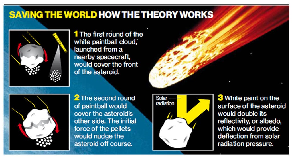 Mr Paek’s intergalactic paintball strategy would see paint pellets fired at an asteroid, covering it in a fine, five-micrometer layer of paint. This would then take advantage of solar radiation pressure – the force exerted on objects by the sun’s photons – to deviate it from an earth bound trajectory.