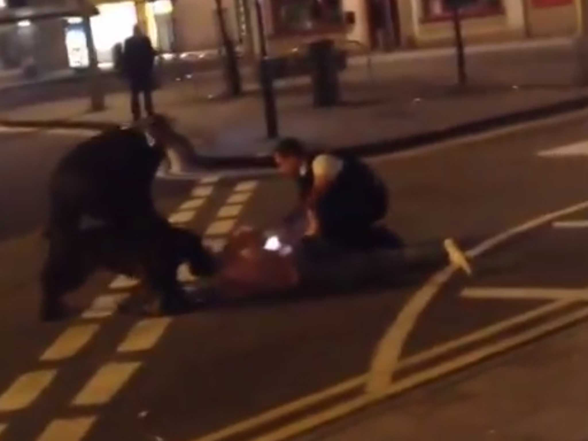 The video, taken by a passer-by, shows the man lying on his front in the road with a police officer behind him and another in front holding the barking dog on a lead.