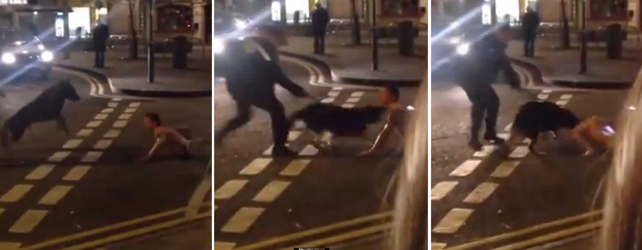 One police officer appears to attempt to pull the dog off but it does not release the man and he is dragged a short way along the road.