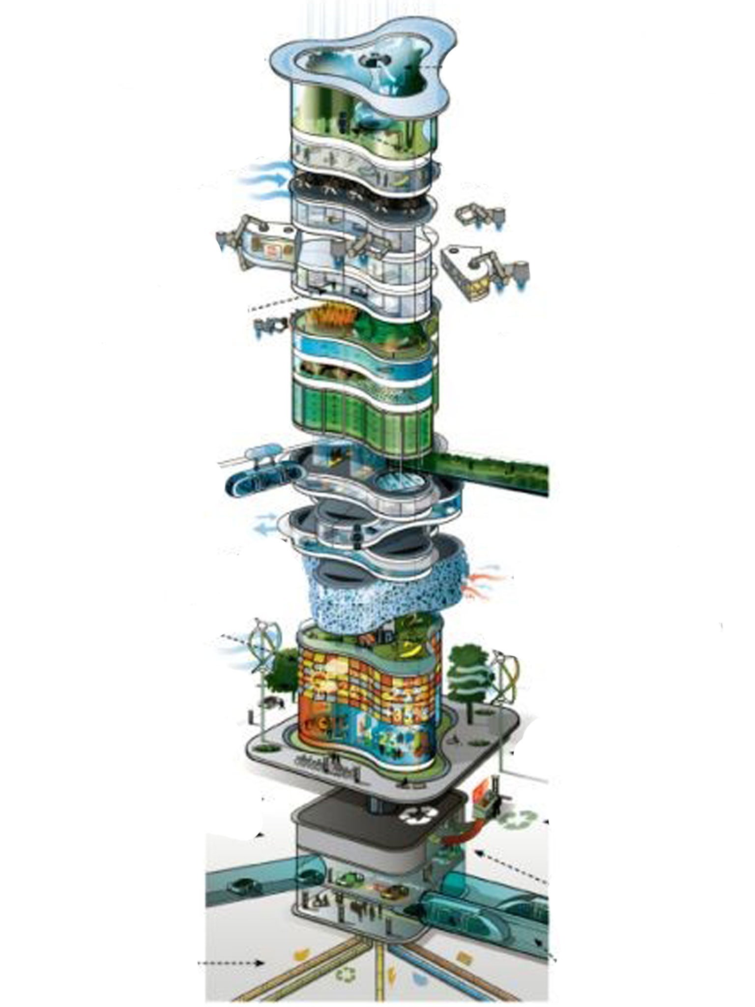 Some “modules” that form the building-blocks of the skyscraper could be used for urban food-production sites housing meat, poultry, fish or vegetable farms. Green spaces inside the tower will “turn the concrete jungle into real jungles,” Mr Hargrave said.