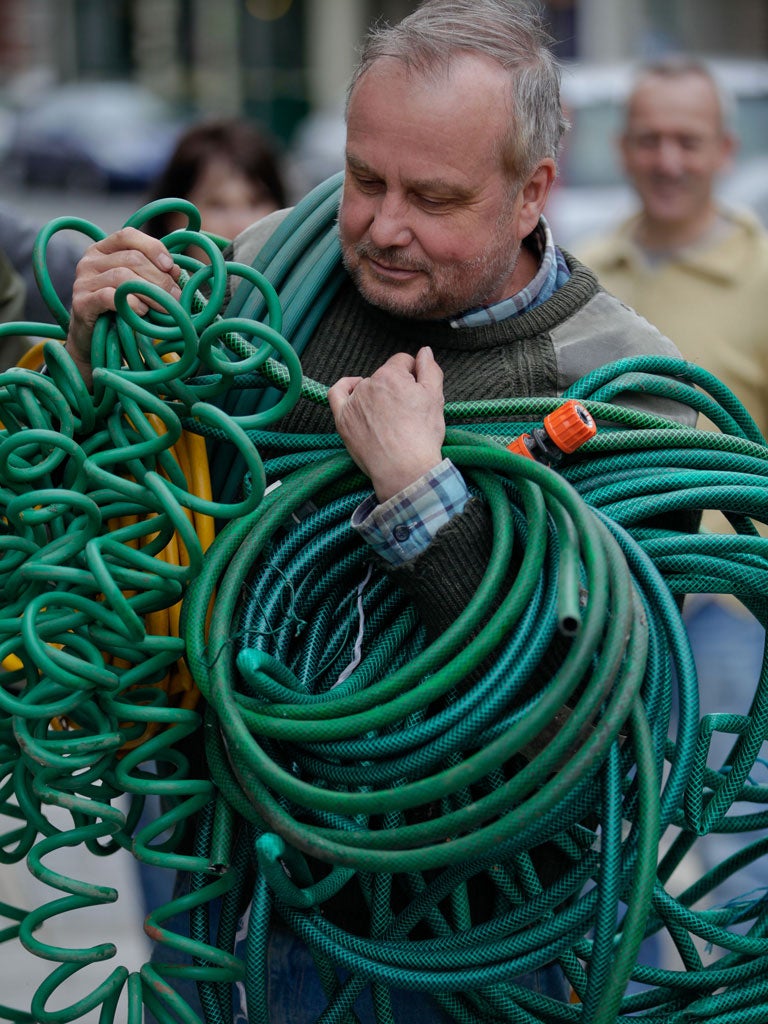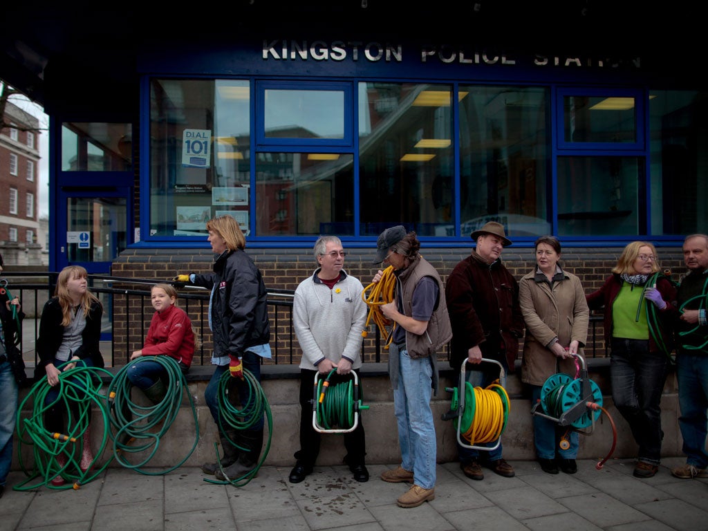 A pilot scheme was being trialled yesterday in Kingston-upon-Thames. By midday a queue had already formed on the steps of the police station, as people prepared to hand over a variety of watering and sprinkling systems. Jo Cobley, 42, was waiting with her son Daniel, eight, and her 30m Maxi Pro Hozelock. "It seems a shame because I love my hose," she said, "but it makes sense to hand it in when you've got kids because they might play with it when you're not looking." In return, they were being given a free "I've piped down!" badge.