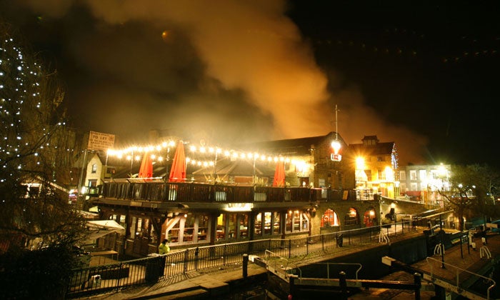 Crowds of revellers from the area's pubs and bars were moved away as the flames took hold and leaped 30 feet into the night sky yesterday from 7.10pm onwards.