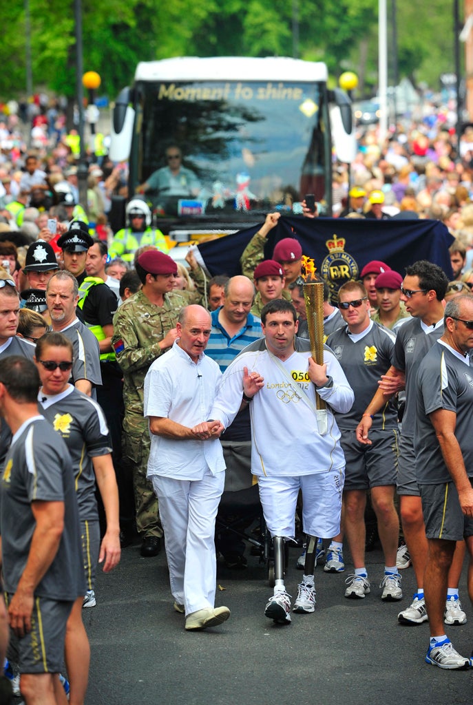 Using his prosthetic legs, he carefully walked his section of the relay supported by his physio - Robert "Shep" Shepherd - and was urged on by people ten deep on either side of the road.